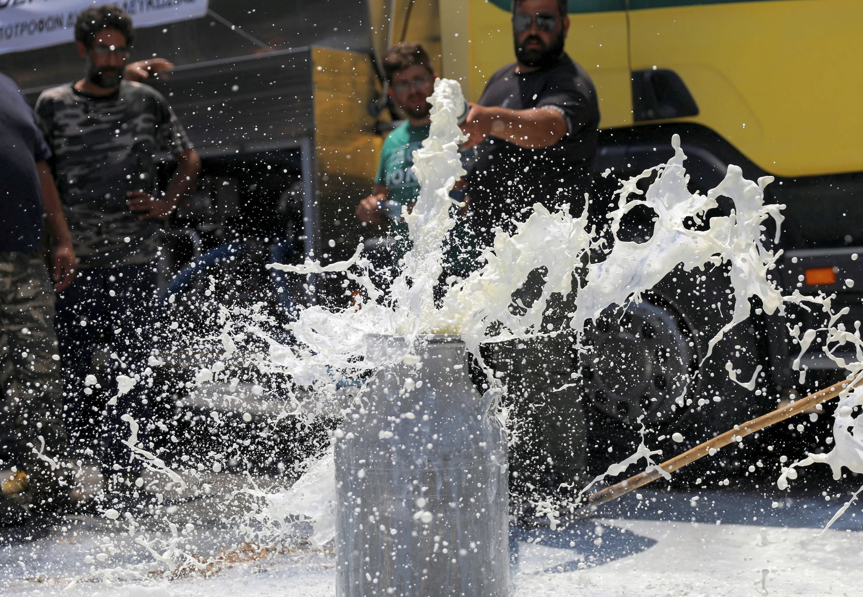 Sheep and goat farmers dump milk during a protest over high prices and production issues related to Halloumi cheese outside the Presidential Palace in Nicosia, Cyprus on May 18, 2022. (Photo by Yiannis Kourtoglou/Reuters)