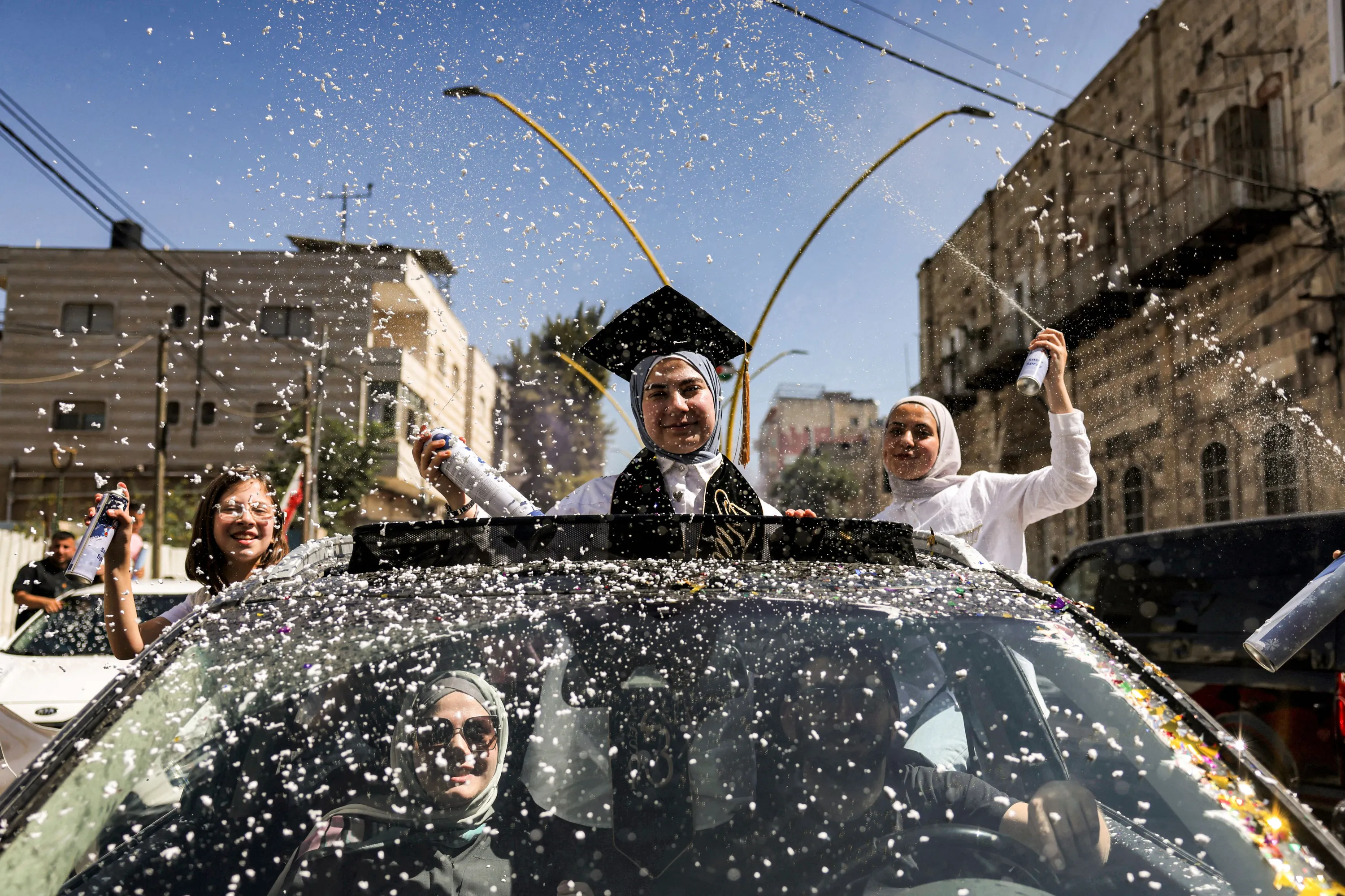 A Palestinian student celebrates in a car as others spray foam around her after the Palestinian Education Ministry announced the results for high school diploma examinations, in the city of Hebron in the occupied West Bank on July 20, 2023. (Photo by Hazem Bader/AFP Photo)