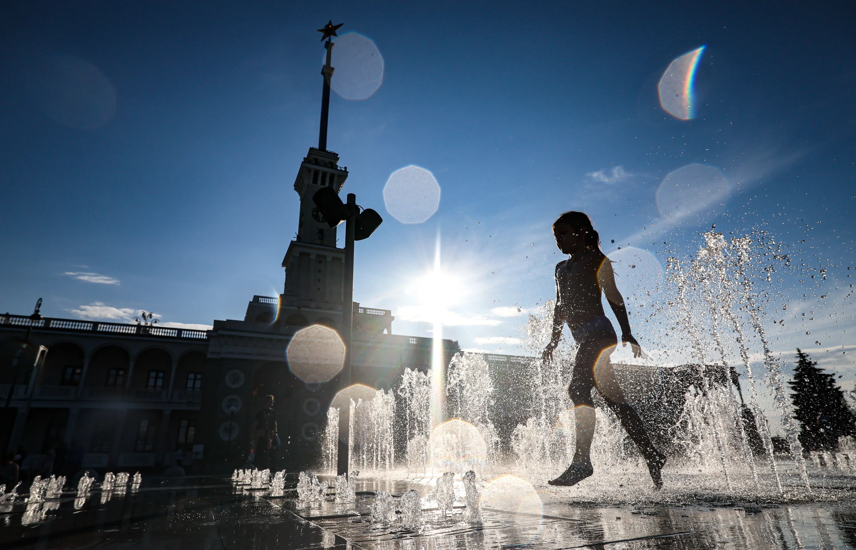 A girl plays with water in a ground fountain at Moscow's North River Terminal in Russia, Moscow on July 16, 2023. (Photo by Sergei Savostyanov/TASS)