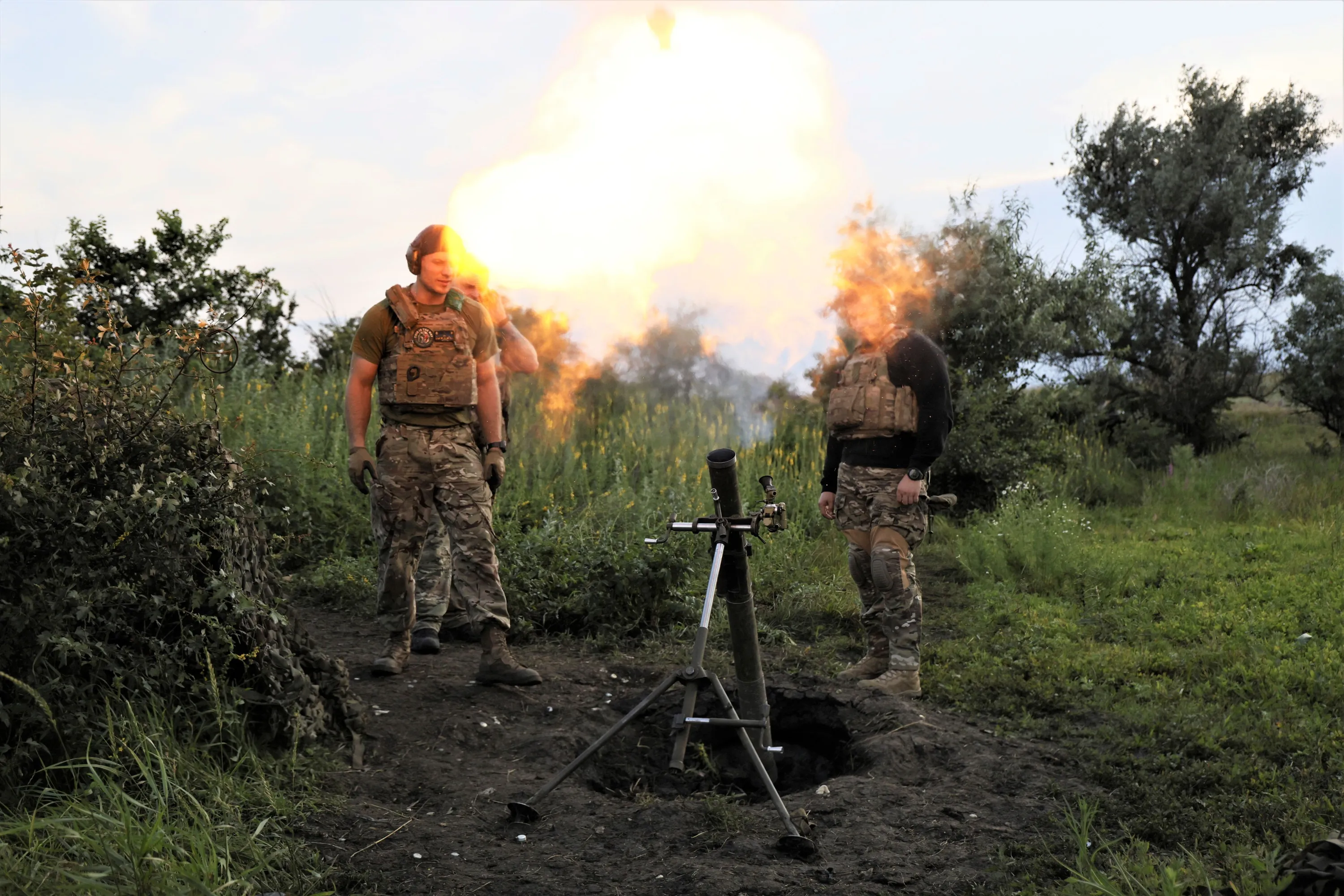Ukrainian servicemen of the 3rd separate assault brigade fire a 82mm mortar towards Russian positions at the front line, near Bakhmut, Donetsk region, Ukraine, Friday, June 30, 2023. (Photo by Alex Babenko/AP Photo)