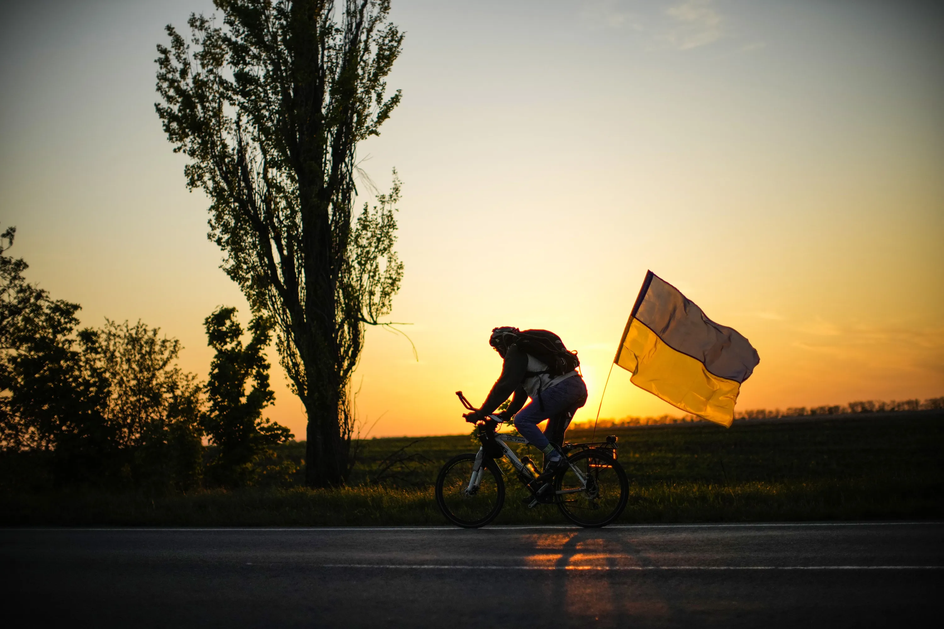 A man rides a bicycle with a Ukrainian flag on the road between Odesa and Mykolaiv, southern Ukraine, Saturday, May 14, 2022. (Photo by Francisco Seco/AP Photo)