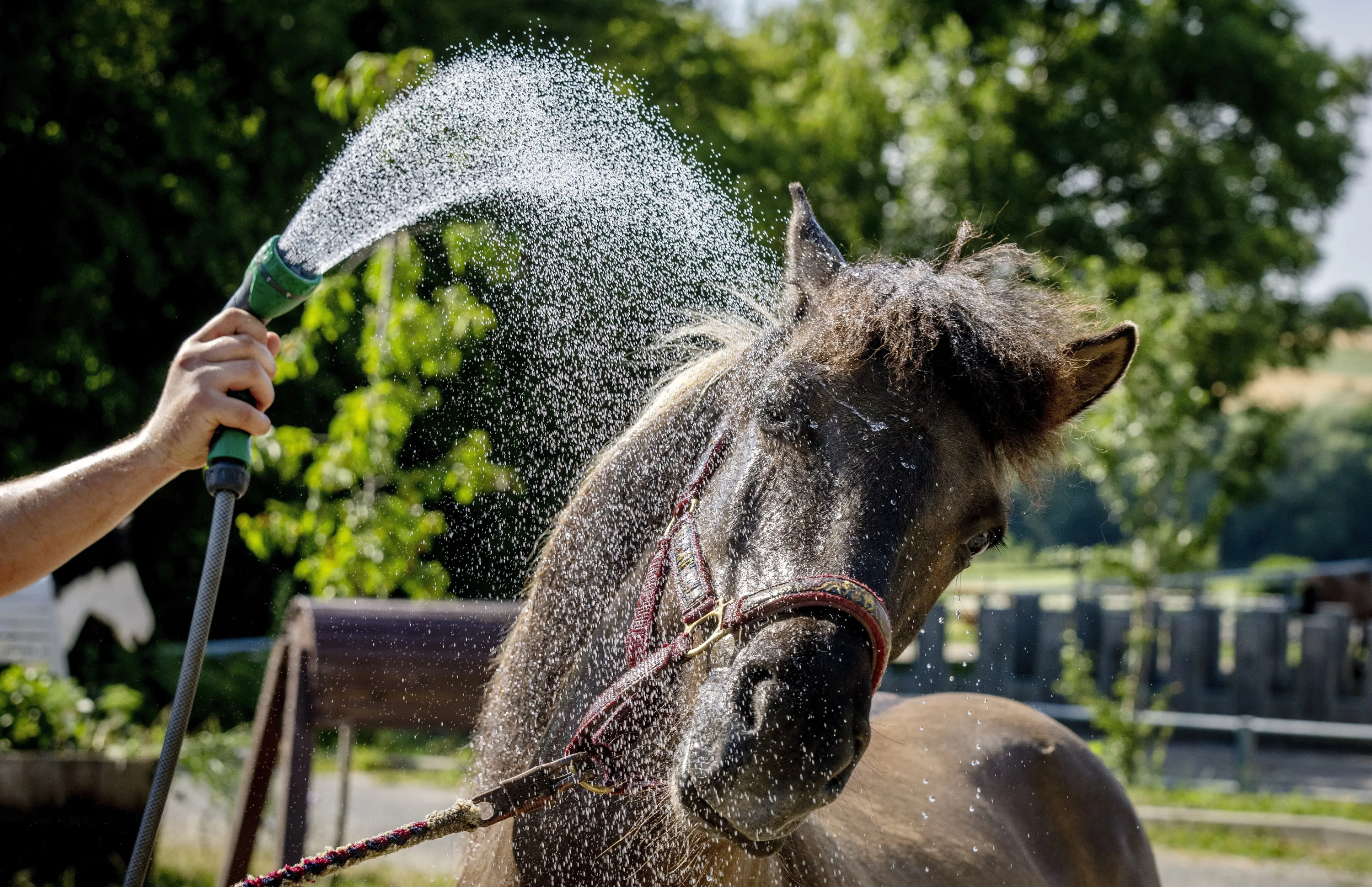 An Icelandic horse is sprayed with water at a stud farm in Wehrheim near Frankfurt, Germany, on a hot Saturday, July 8, 2023. (Photo by Michael Probst/AP Photo)