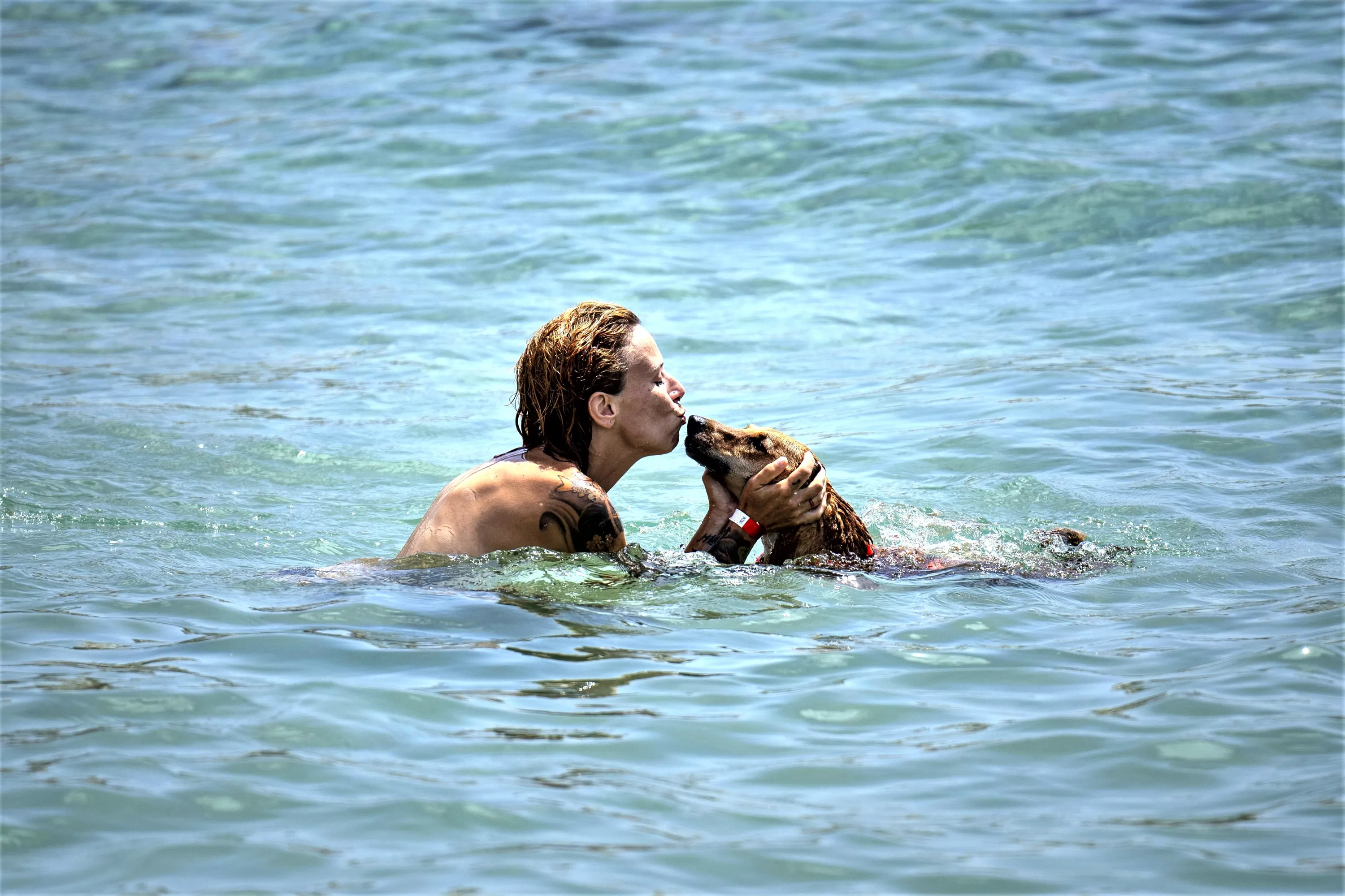 A woman kisses her dog during swimming on a beach in Barcelona, Spain, Monday, July 17, 2023. Spain's Aemet weather agency said a heatwave starting Monday “will affect a large part of the countries bordering the Mediterranean” with temperatures in some southern areas of Spain exceeding 42-44 ºC. (Photo by Emilio Morenatti/AP Photo)