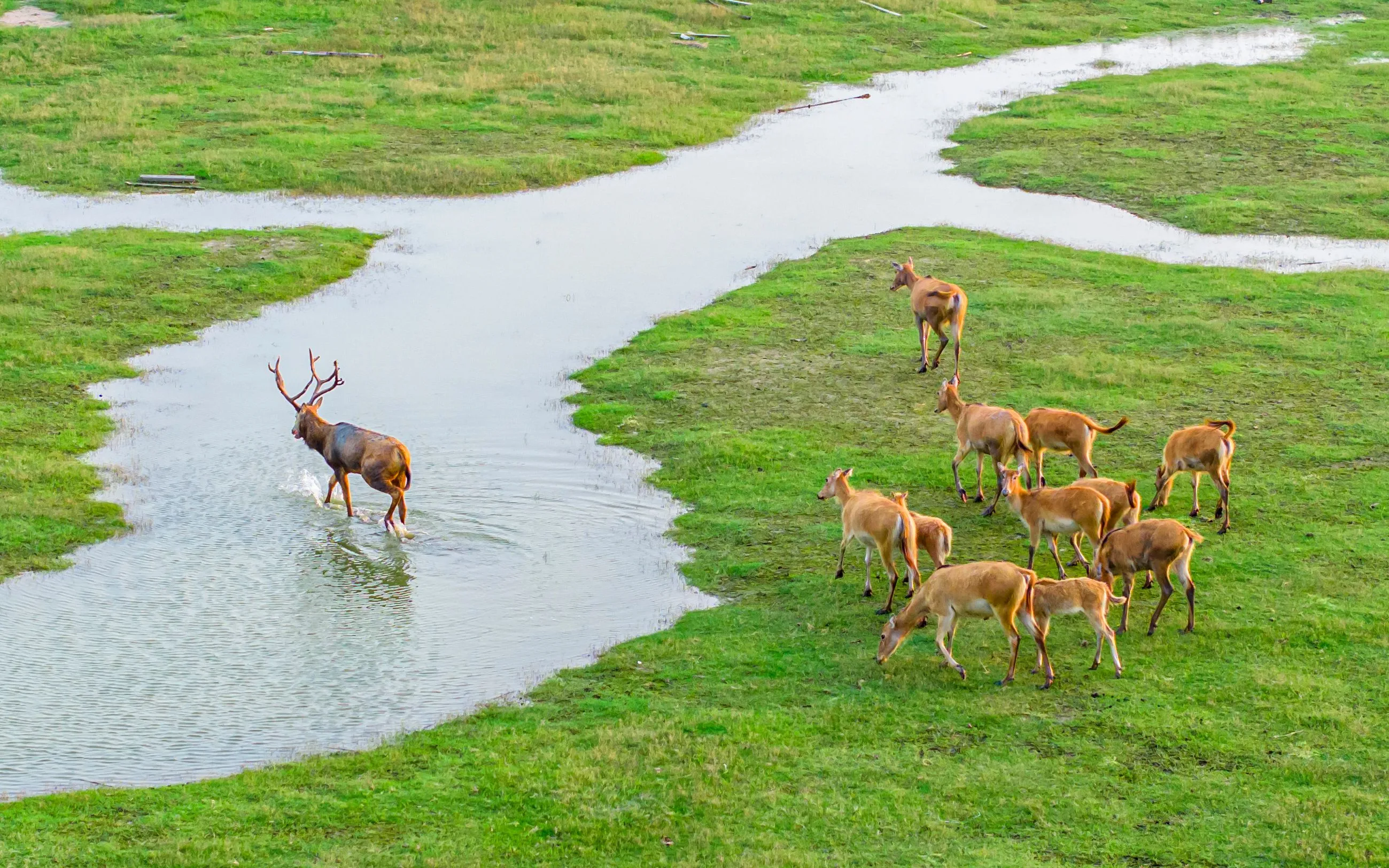 Elks play in the Yellow Sea Yeludang mudflat in Yancheng City, Jiangsu Province, China, July 9, 2023. (Photo by Costfoto/NurPhoto via Getty Images)
