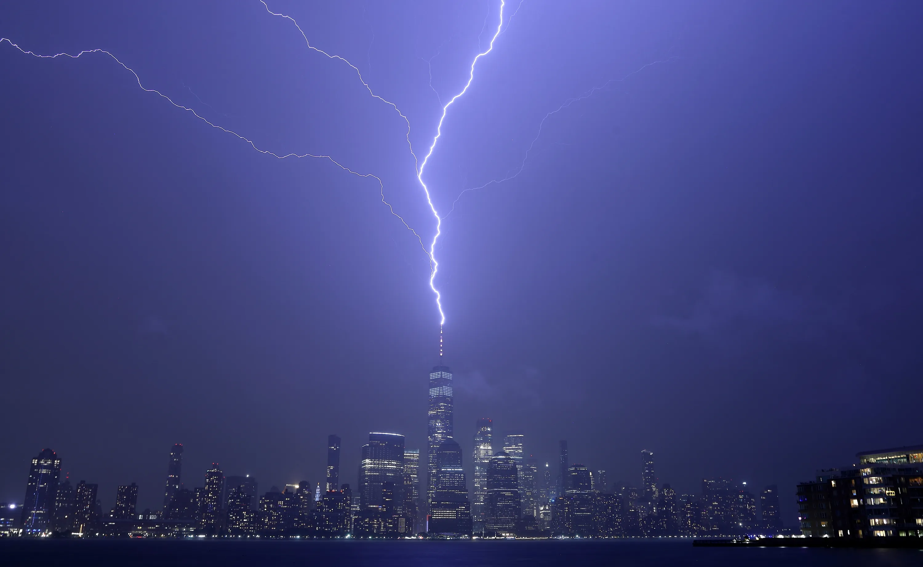 A lightning bolt strikes One World Trade Center in New York City during a thunderstorm on September 25, 2022, as seen from Jersey City, New Jersey. (Photo by Gary Hershorn/Getty Images)