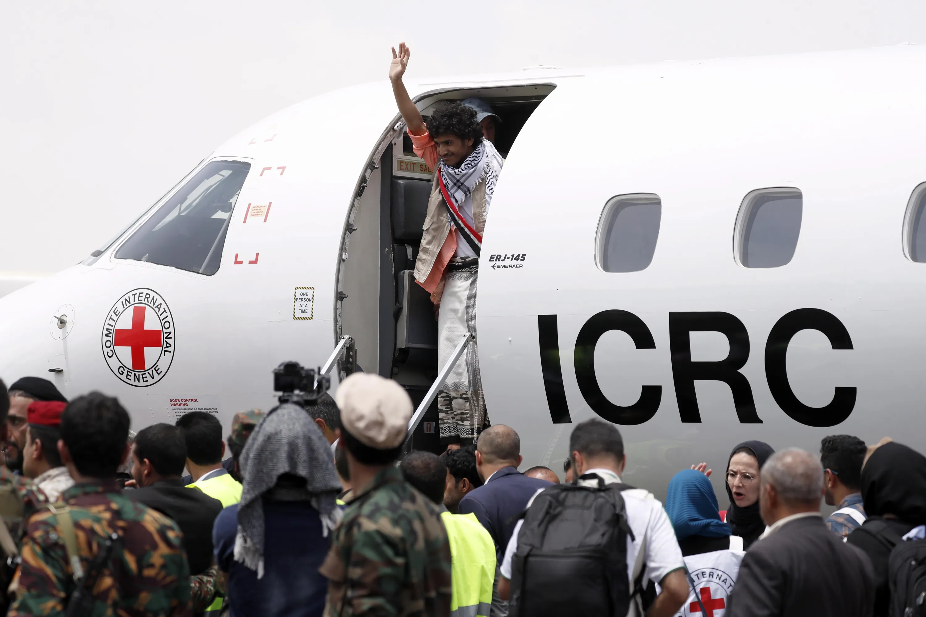 Freed houthi prisoners upon arrival at Sana'a airport on the third day of a prisoner swap in Sana'a, Yemen, 16 April 2023 Yemen's warring parties began on 14 April a three-day exchange of 887 prisoners. The Houthis have agreed to release 181 detainees, including Saudis and Sudanese soldiers who fought alongside Yemeni government forces, in exchange for 706 prisoners held by the Yemeni government, under the UN and ICRC-brokered prisoner swap deal reached last March in Switzerland. (Photo by Yahya Arhab/EPA/EFE)