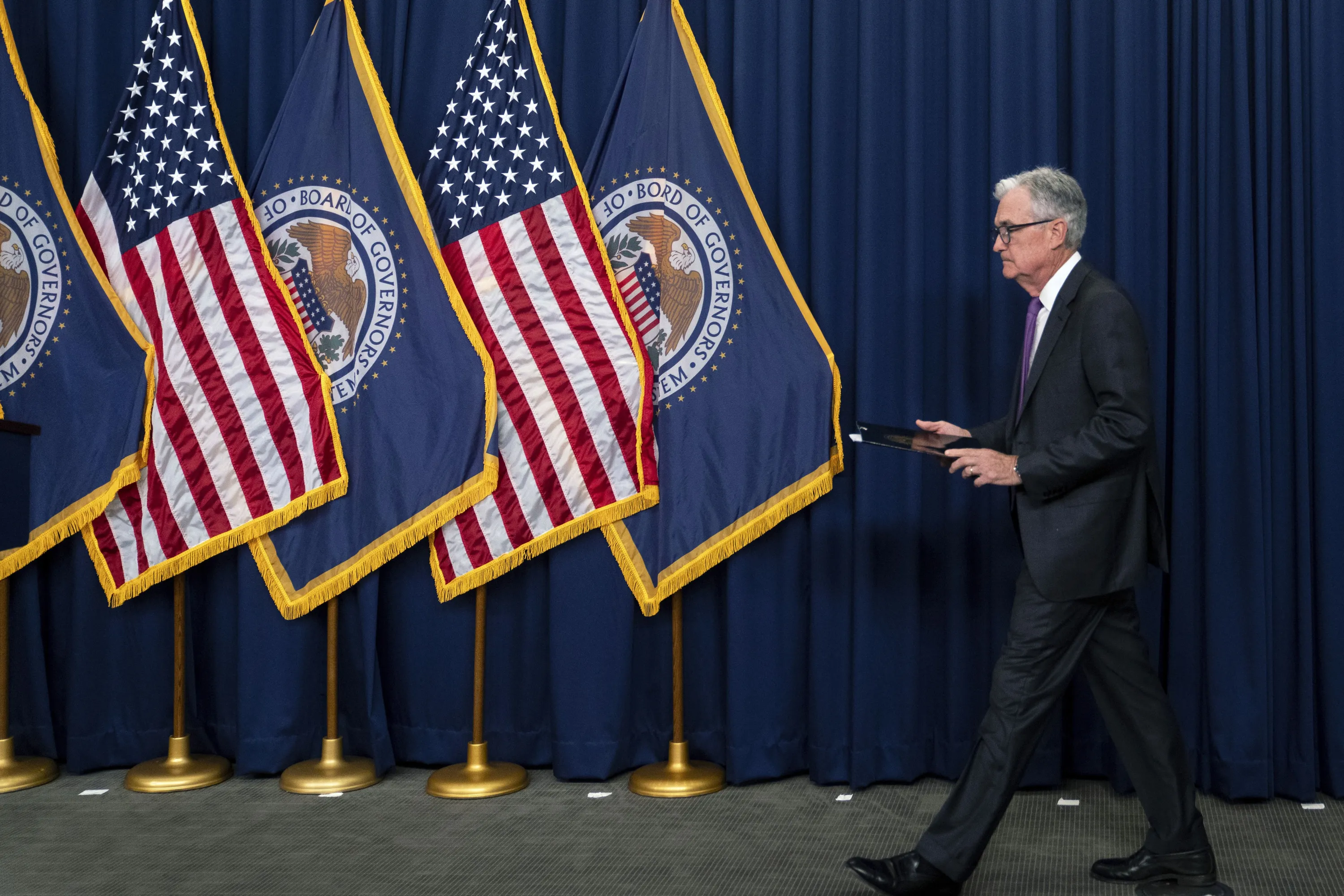 Federal Reserve Chair Jerome Powell arrives for a news conference at the William McChesney Martin Jr. Federal Reserve Board Building following a Federal Open Market Committee meeting on Wednesday, July 26, 2023 in, Washington. (Photo by Nathan Howard/AP Photo)