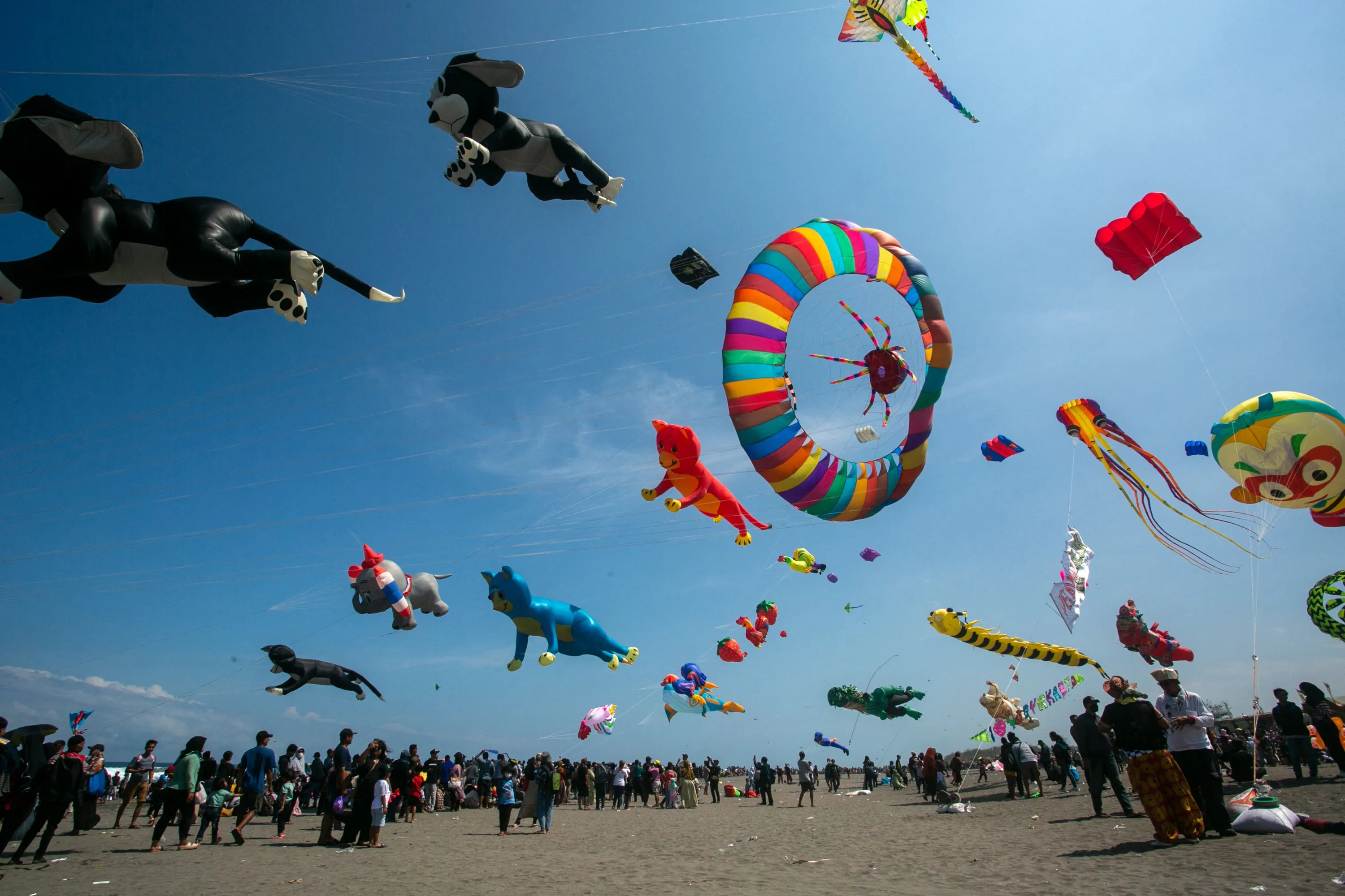 Participants play with kites during the International kites festival in Bantul, Yogyakarta on July 16, 2023. (Photo by Devi Rahman/AFP Photo)