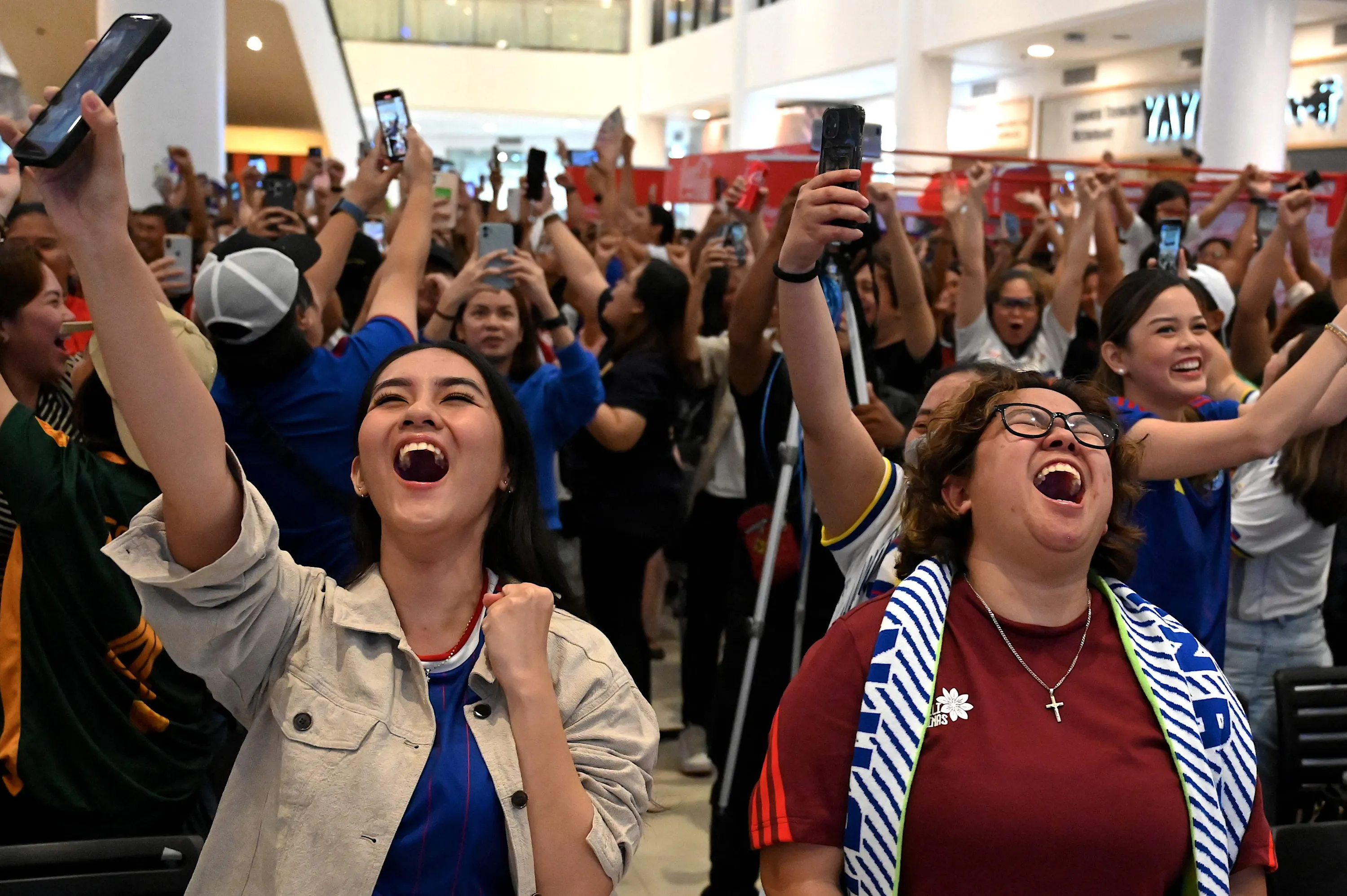 People react during a watch party at a mall in Quezon City, Metro Manila on July 25, 2023 for the Australia and New Zealand 2023 Women's World Cup Group A football match between the Philippines and New Zealand in Wellington. (Photo by Jam Sta Rosa/AFP Photo)