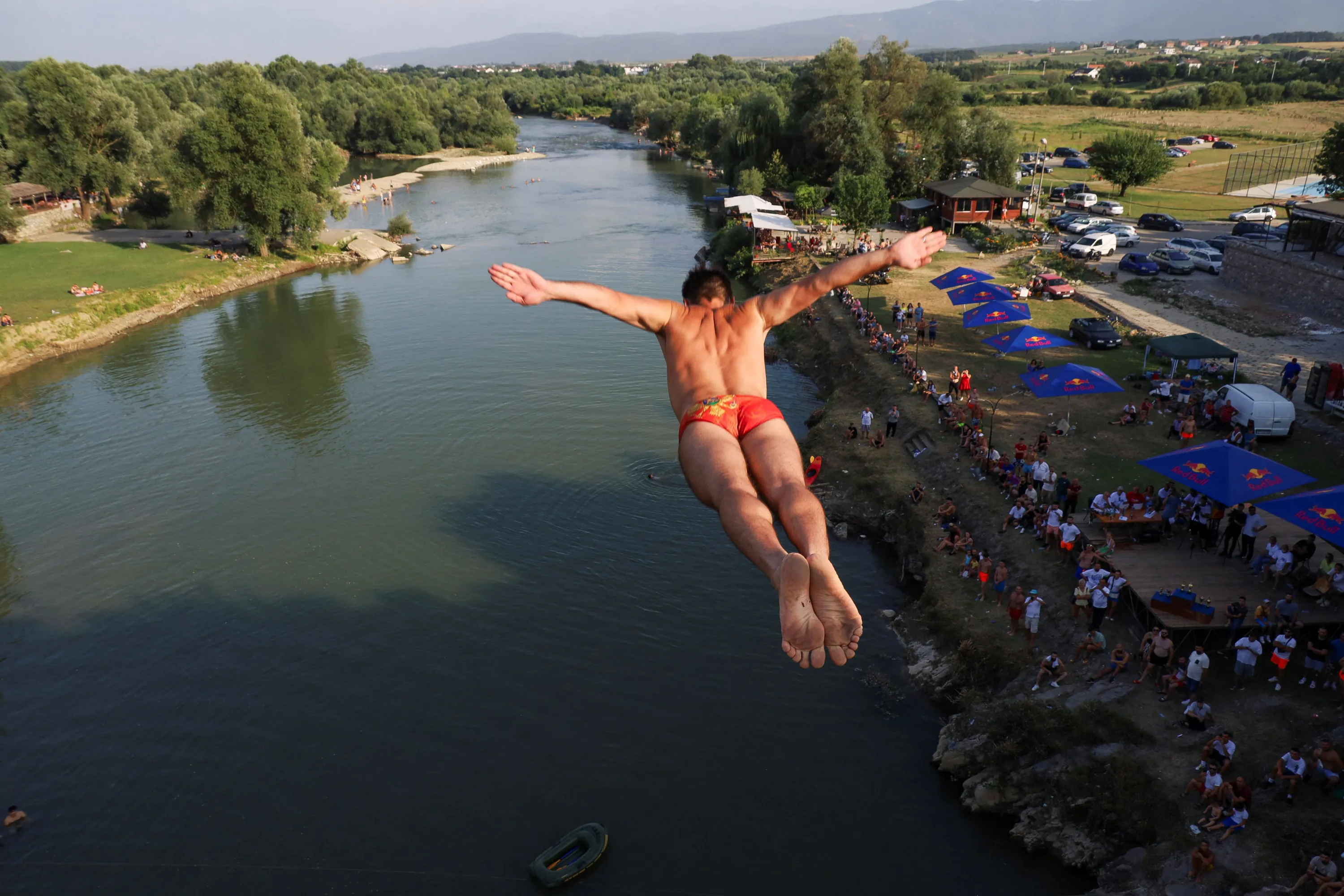 Evald Krnic, a diver from Montenegro, jumps from a bridge during a competition on the White Drin River, near the town of Gjakova, Kosovo on July 23, 2023. (Photo by Fatos Bytyci/Reuters)