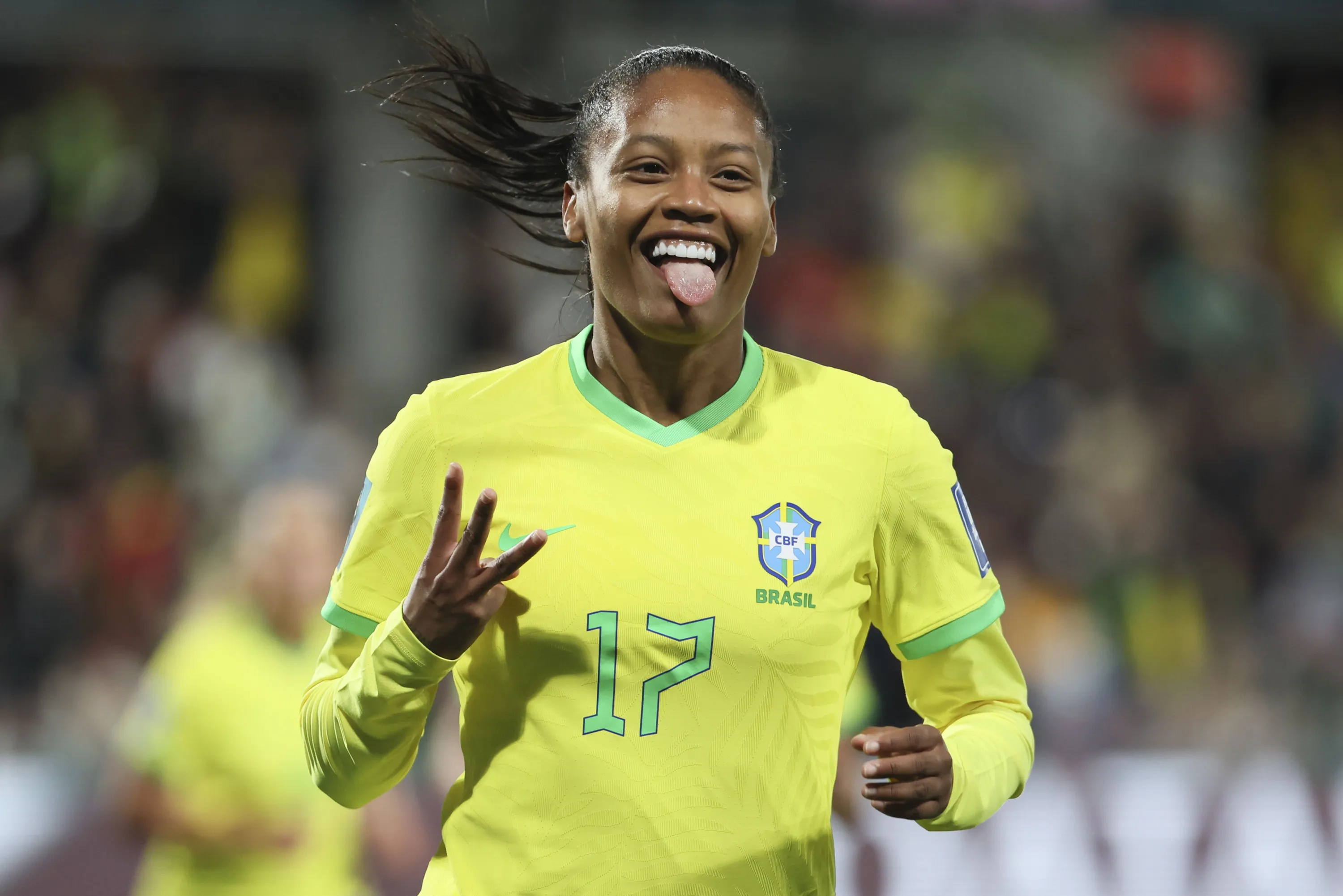 Brazil's Ary Borges celebrates her hat trick goal during the Women's World Cup Group F soccer match between Brazil and Panama in Adelaide, Australia, Monday, July 24, 2023. (Photo by James Elsby/AP Photo)