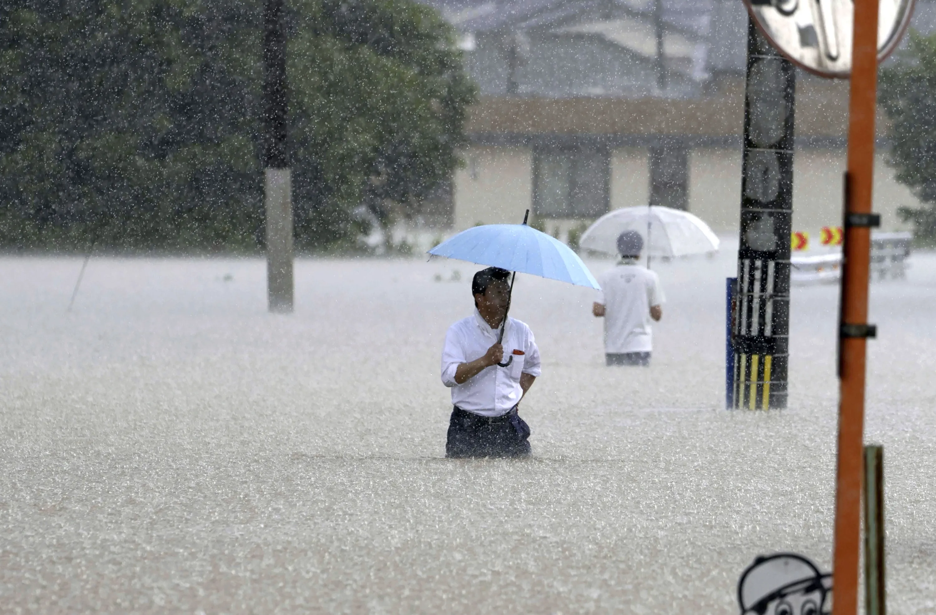 People wade through a street due to a heavy rain in Kurume, Fukuoka prefecture, southern Japan Monday, July 10, 2023. Torrential rain has been pounding southwestern Japan, triggering floods and mudslides. (Photo by Kyodo News via AP Photo)