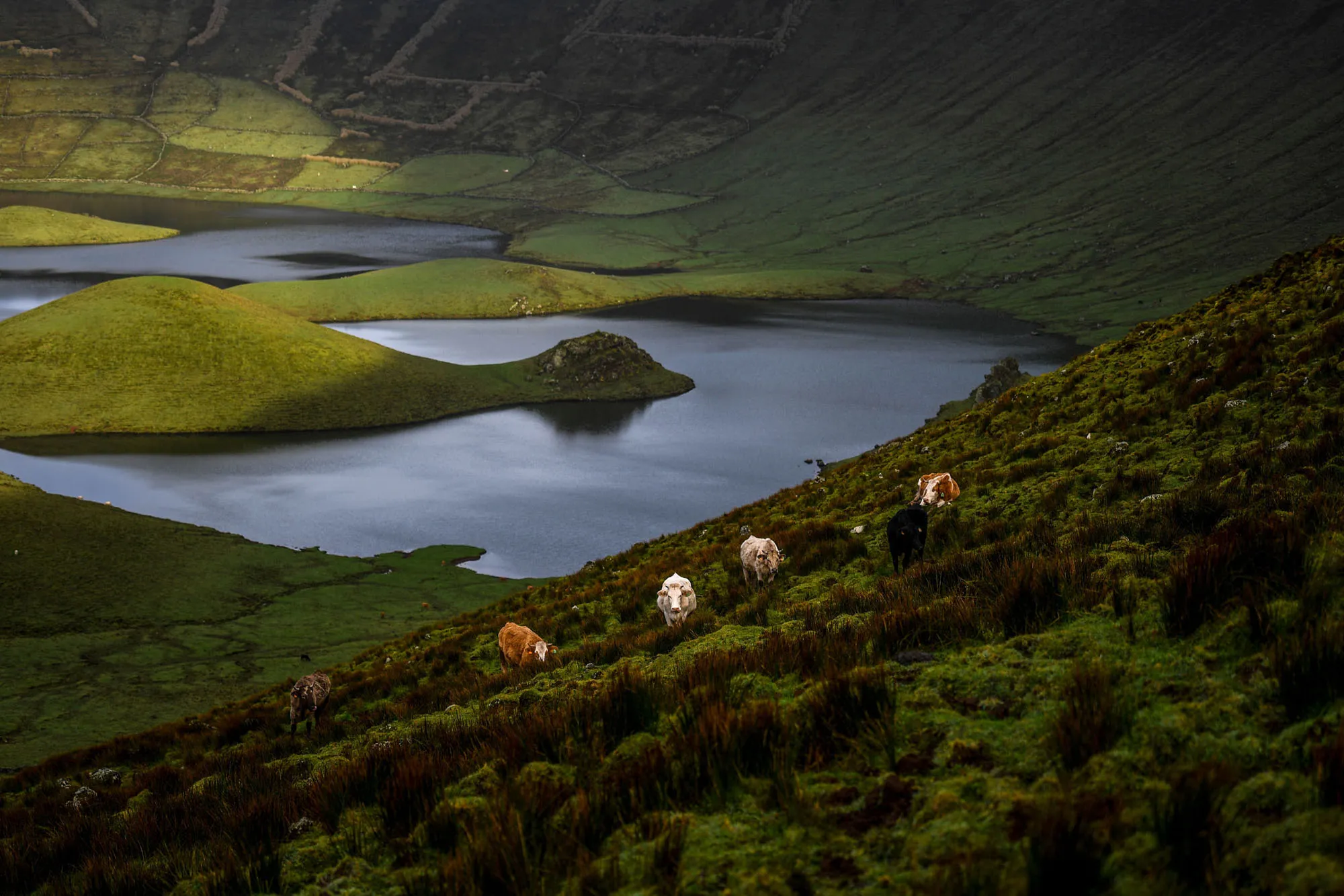 Cows graze in the Caldeirao crater on the Azores archipielago's island of Corvo on March 12, 2021. (Photo by Patricia De Melo Moreira/AFP Photo)