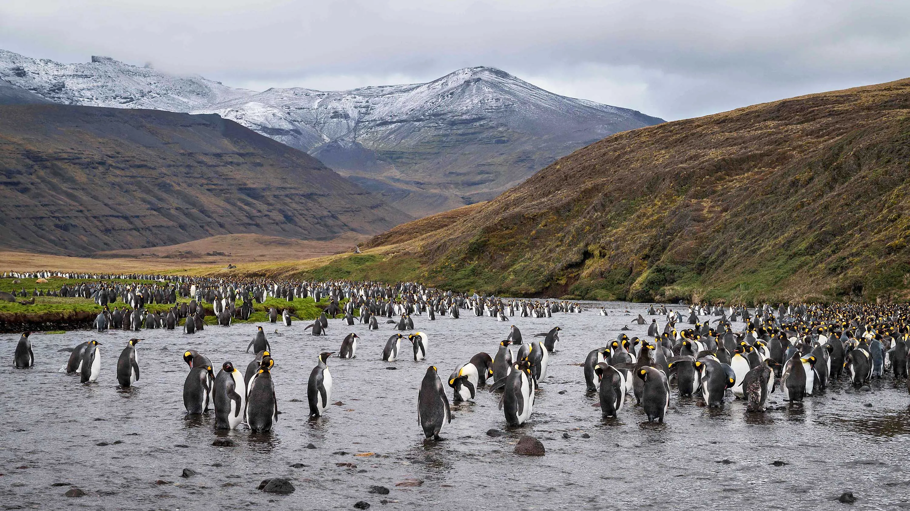 Penguins (Manchots Royaux) are pictured early in the morning on December 21, 2022 on the Desolation Island, part of the Crozet Islands which are a sub-Antarctic archipelago of small islands in the southern Indian Ocean. They form one of the five administrative districts of the French Southern and Antarctic Lands. The Crozet Islands are home to four species of penguins. Most abundant are the macaroni penguin, of which some 2 million pairs breed on the islands, and the king penguin, home to 700,000 breeding pairs; half the world's population. Mammals living on the Crozet Islands include fur seals and southern elephant seals. Killer whales have been observed preying upon the seals. (Photo by Patrick Hertzog/AFP Photo)