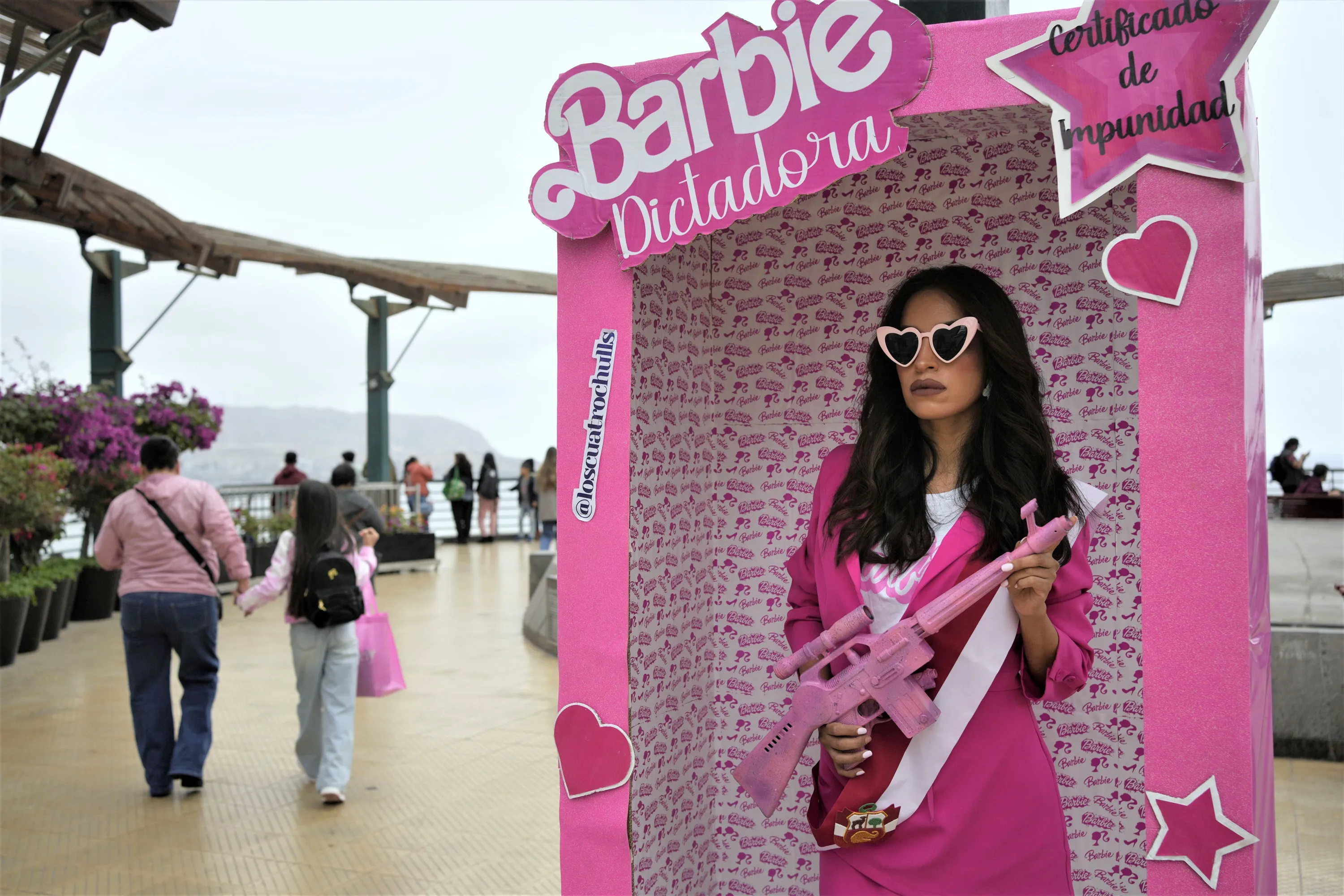 An anti-government protester, dressed as Barbie holding a fake gun, takes part in a demonstration demanding that Peruvian President Dina Boluarte call for immediate presidential elections as well as justice for those who were killed during protests earlier this year after the ouster of her predecessor, in Lima, Peru, Saturday, July 22, 2023. (Photo by Martin Mejia/AP Photo)