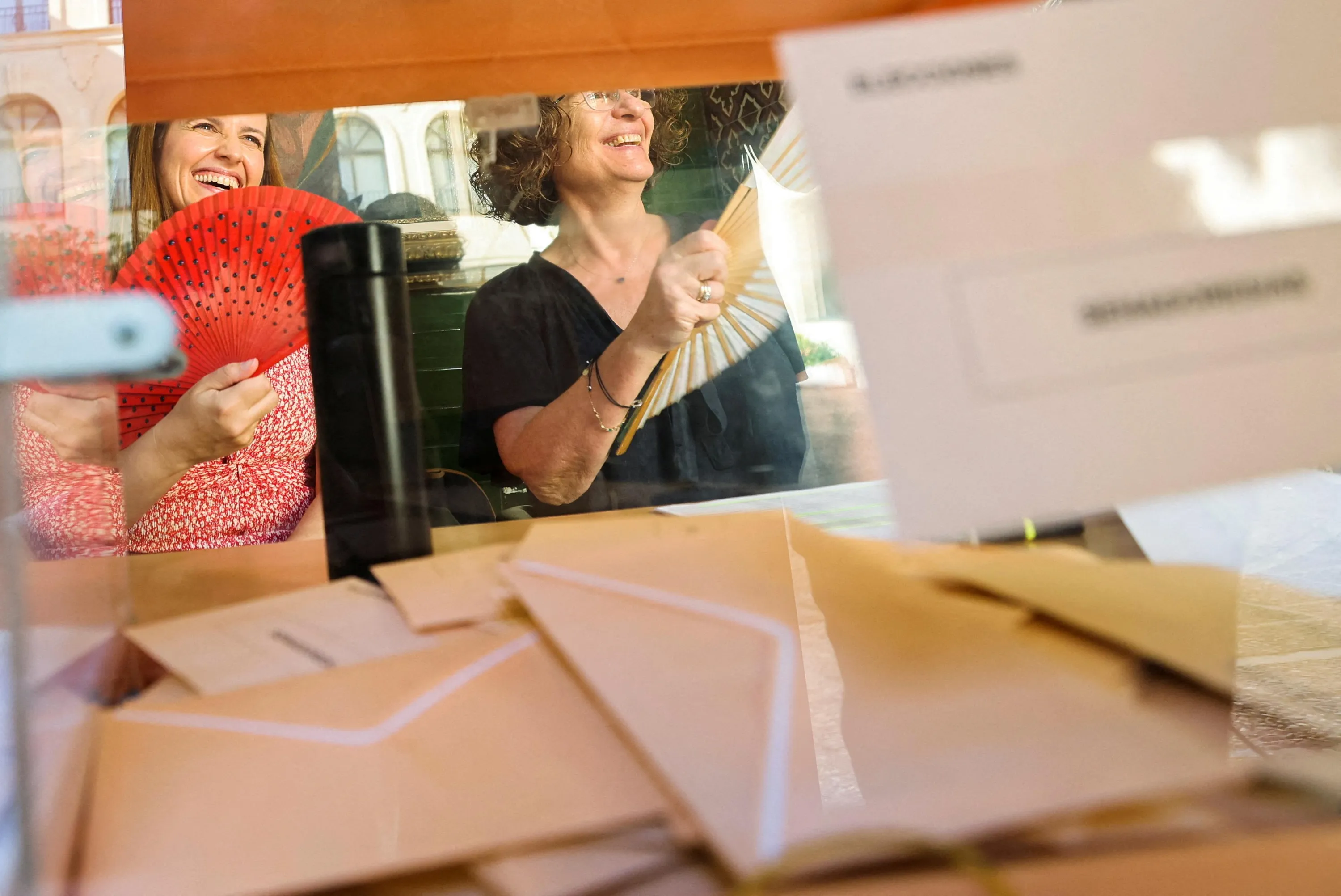 Poll workers use fans as they pose for a picture during the general snap election in Madrid, Spain on July 23, 2023. (Photo by Nacho Doce/Reuters)