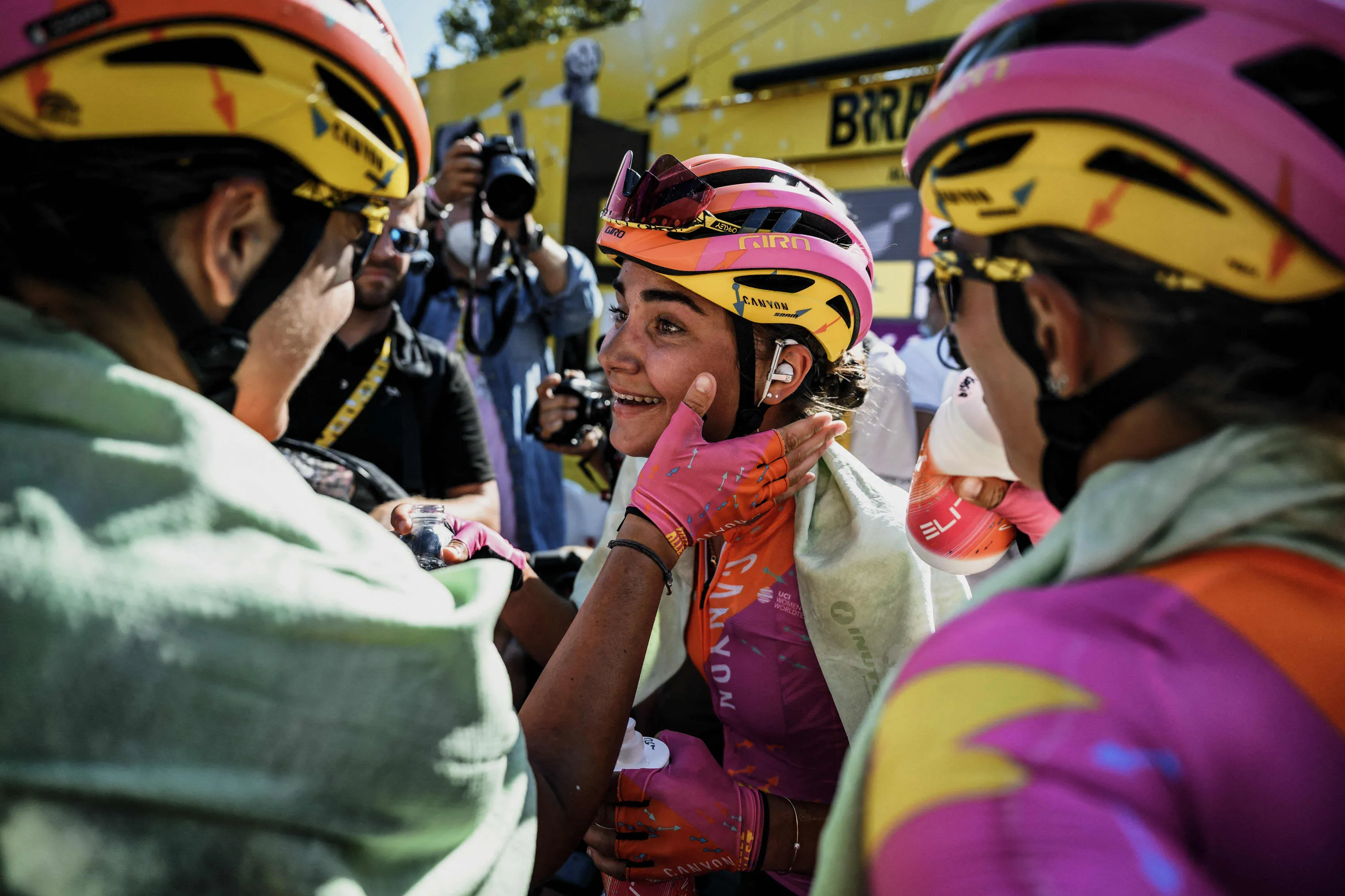 Canyon-SRAM Racing's German rider Ricarda Bauernfeind (C) is congratulated by teammates after she won the fifth stage (out of 8) of the second edition of the Women's Tour de France cycling race 126,5 km between Onet-Le-Chateau and Albi, in the Tarn region, south-western France, on July 27, 2023. (Photo by Jeff Pachoud/AFP Photo)
