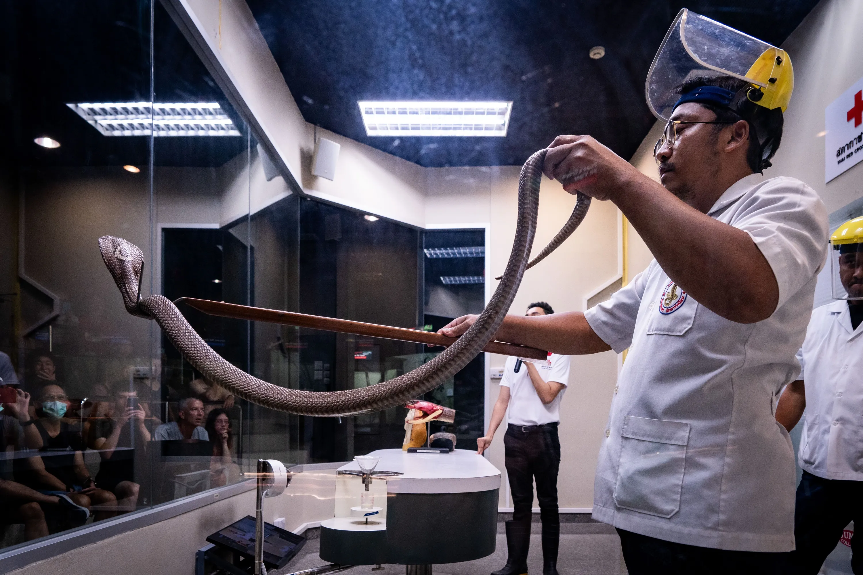 A snake handler shows a cobra to an audience during a venom extraction at Queen Saovbha Memorial Institute in Bangkok, Thailand on July 11, 2023. Queen Saovbha Memorial Institute, a research center associated with the Thai Red Cross Society, was established in 1923 as the “Bangkok Snake Farm”. The research establishment has raised venomous snakes for venom extraction and production of antivenom medicine supplied primarily to farmers, hospitals, and people living in Thailand and surrounding countries in the region, where venomous snakes are endemic. The institute also serves as a museum to inform the general public about snakes in Thailand. (Photo by Matt Hunt/Anadolu Agency via Getty Images)