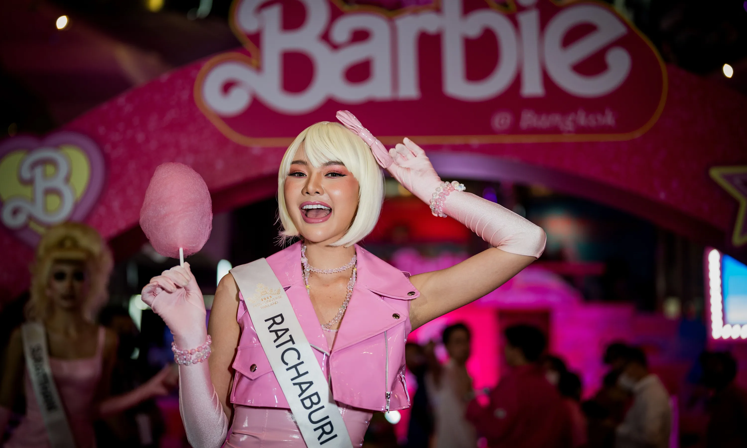 Miss Ratchaburi poses with cotton candy at the “Barbie” premiere in Bangkok, Thailand on July 19, 2023. People attend the pink carpet world premiere of “Barbie” movie by Warner Bros. (Photo by Matt Hunt/Anadolu Agency via Getty Images)