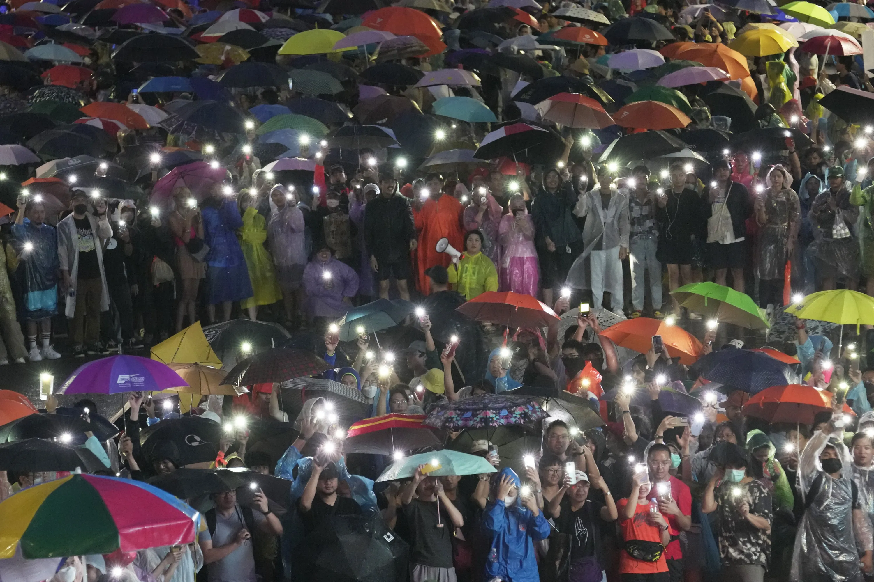 Supporters of the Move Forward Party display mobile phones with flash lights on during a protest in Bangkok, Thailand, Sunday, July 23, 2023. The demonstrators are protesting that Thailand's Constitution is undemocratic, because it allowed Parliament to block the winner of May's general election, the Move Forward Party, from naming its leader named the new prime minister, even though he had assembled an eight-part coalition that had won a clear majority of seats in the House of Representatives. (Photo by Sakchai Lalit/AP Photo)