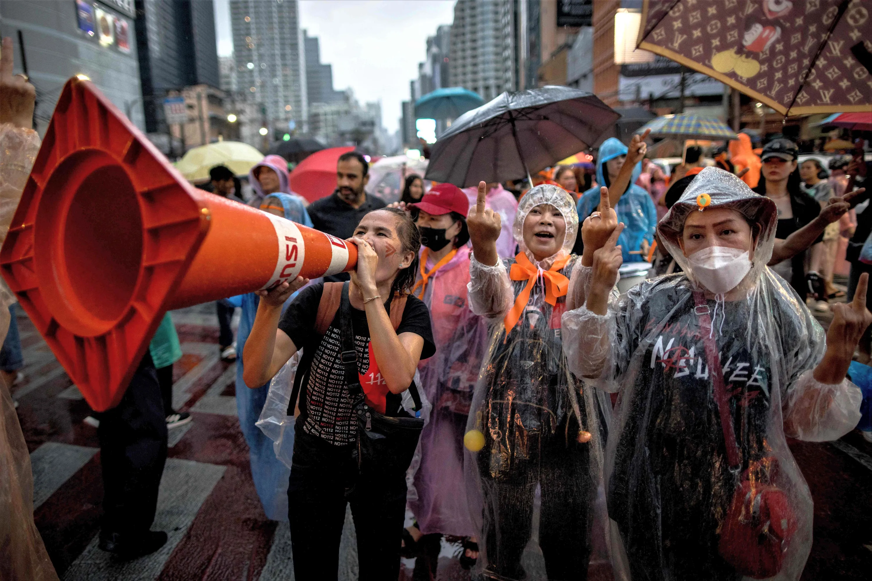Pro-democracy protesters gesture during a demonstration in support of the Move Forward Party in Bangkok on July 23, 2023 after Thailand's parliament blocked the party leader Pita Limjaroenrat's prime ministerial nomination. (Photo by Jack Taylor/AFP Photo)