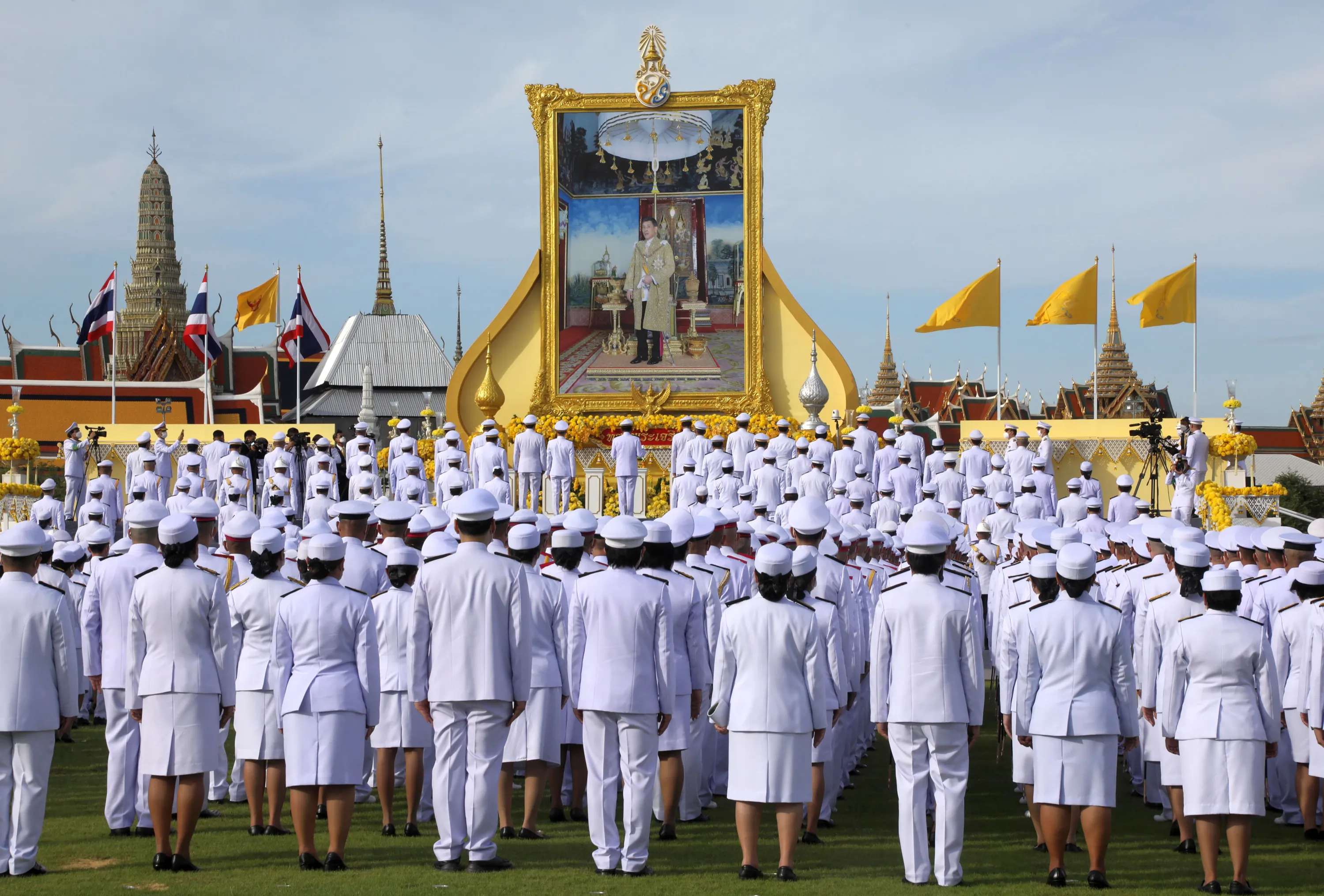 Thai caretaker Prime Minister Prayut Chan-o-cha (C) leads his cabinet and government officials in the salute to the portrait of Thai King Maha Vajiralongkorn Bodindradebayavarangkun during a ceremony for taking the oath of allegiance to become lawful civil servants, held to mark the king's 71st birthday at the royal grounds of Sanam Luang, outside the Grand Palace in Bangkok, Thailand, 28 July 2023. Thai King Maha Vajiralongkorn celebrates his 71st birthday on 28 July 2023. (Photo by Narong Sangnak/EPA)