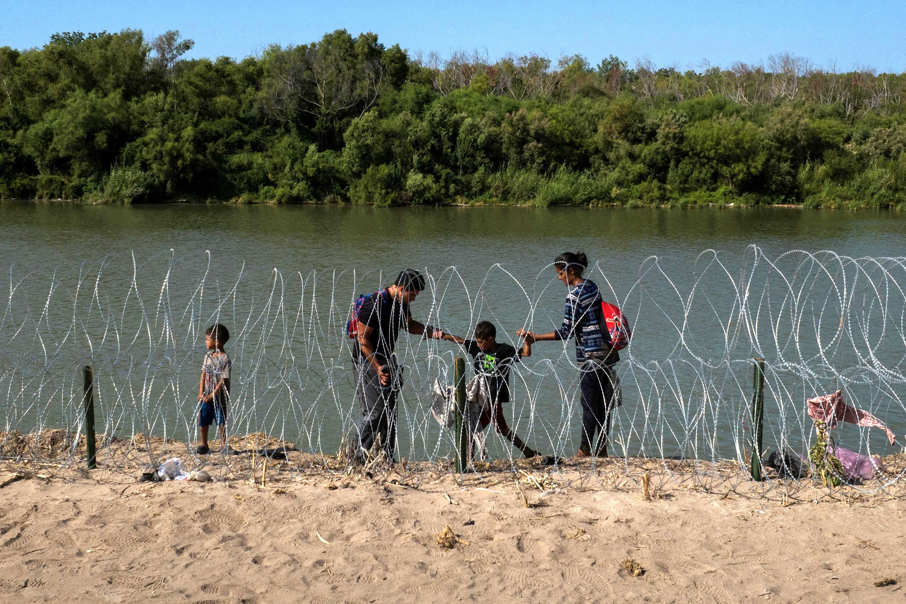 A family navigates the bank of the Rio Grande past razor wire while searching for an entry point into the United States from Mexico, in Eagle Pass, Texas, U.S. July 30, 2023. (Photo by Adrees Latif/Reuters)