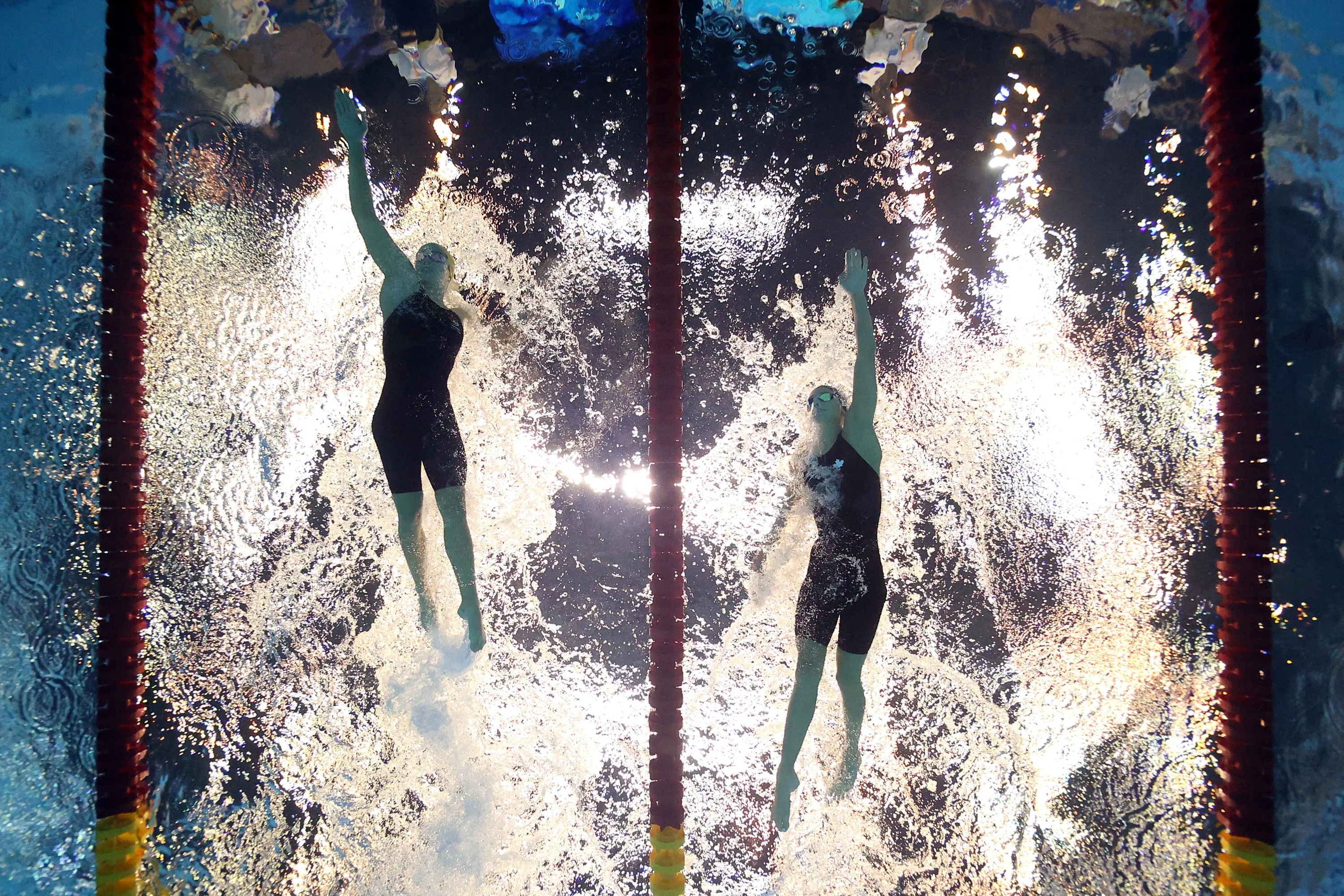 Summer Mcintosh of Team Canada and Jenna Forrester of Team Australia competes in the Women's 400m Individual Medley Heats on day eight of the Fukuoka 2023 World Aquatics Championships at Marine Messe Fukuoka Hall A on July 30, 2023 in Fukuoka, Japan. (Photo by Sarah Stier/Getty Images)