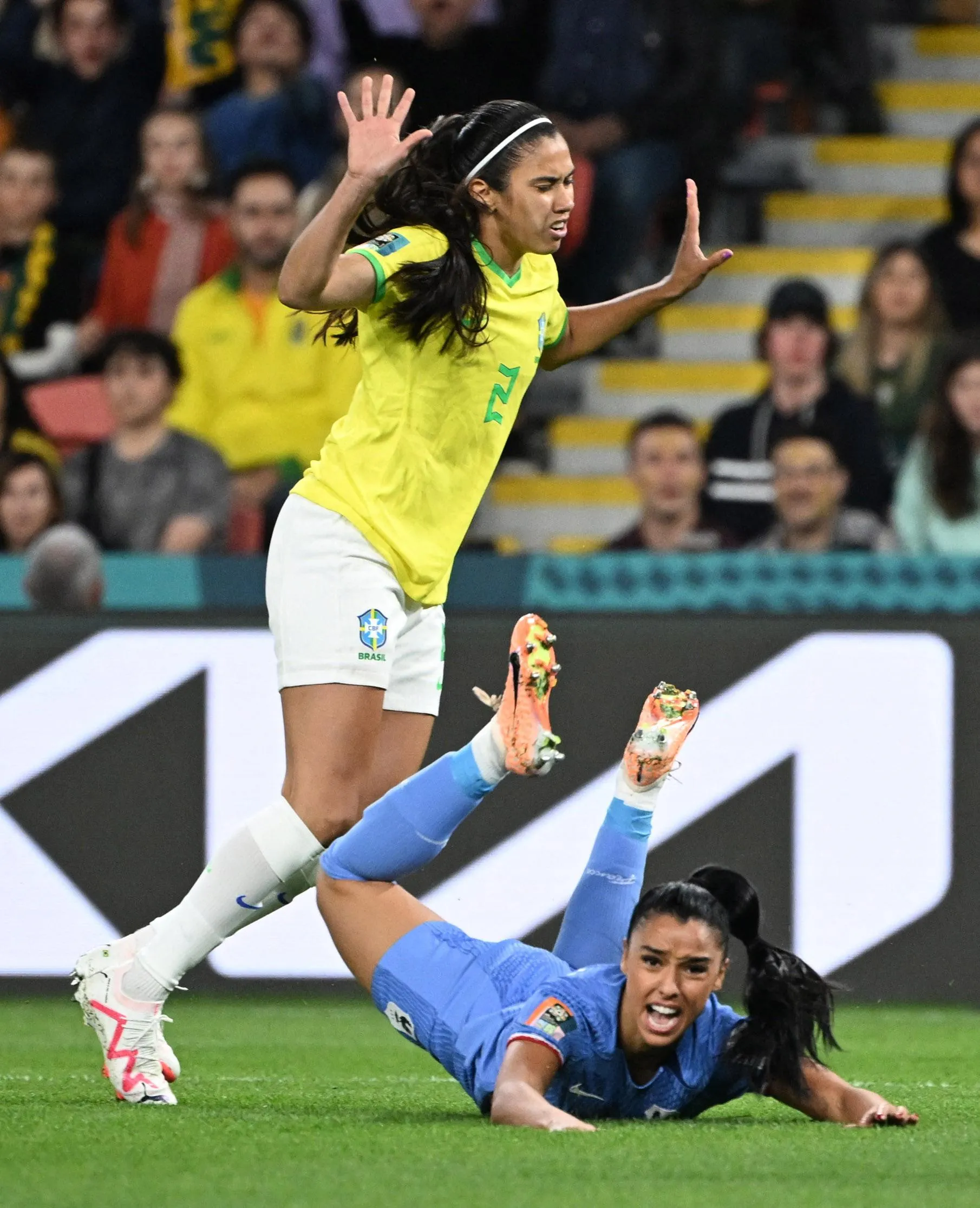 Sakina Karchaoui of France and Antônia Ronnycleide da Costa Silva of Brazil during the FIFA Women's World Cup Australia & New Zealand 2023 Group match between France and Brazil at Brisbane Stadium on July 29, 2023. France won the game 2-1. (Photo by Dan Peled/Reuters)