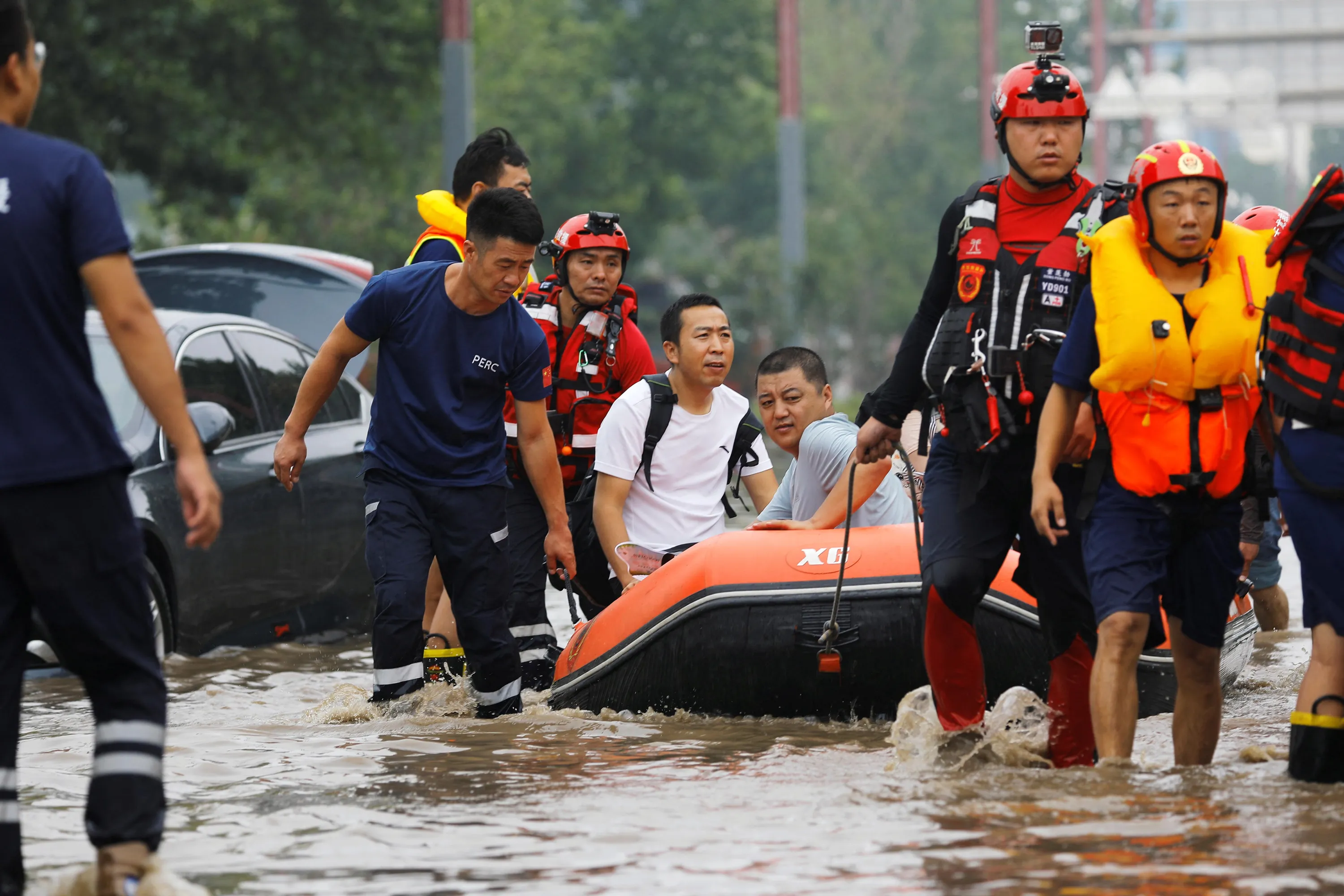 Rescue workers evacuate flood-affected residents using a boat after remnants of Typhoon Doksuri brought rains and floods in Beijing, China on August 2, 2023. (Photo by Tingshu Wang/Reuters)