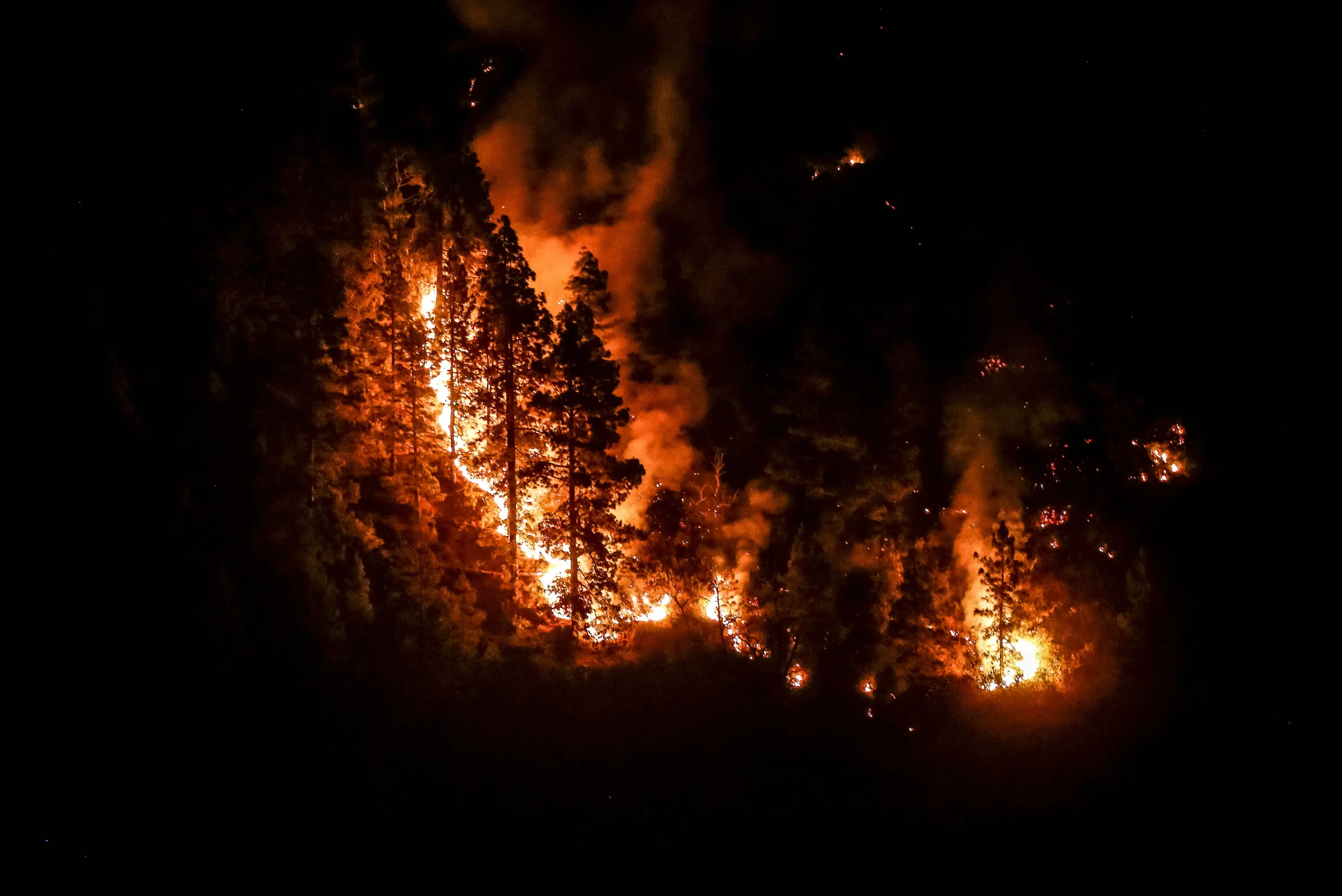 This photograph taken late on July 17, 2023 shows a firebreak lit up by the "BRIFOR" firefighting forest brigade to prevent the advance of the flames at the bottom of the Barranco del Jurado ravine, above the Tijarafe municipality on the Spanish Canary Island of La Palma, as a forest fire that began on July 15 has destroyed 4,000 hectares of land. (Photo by Desiree Martin/AFP Photo)