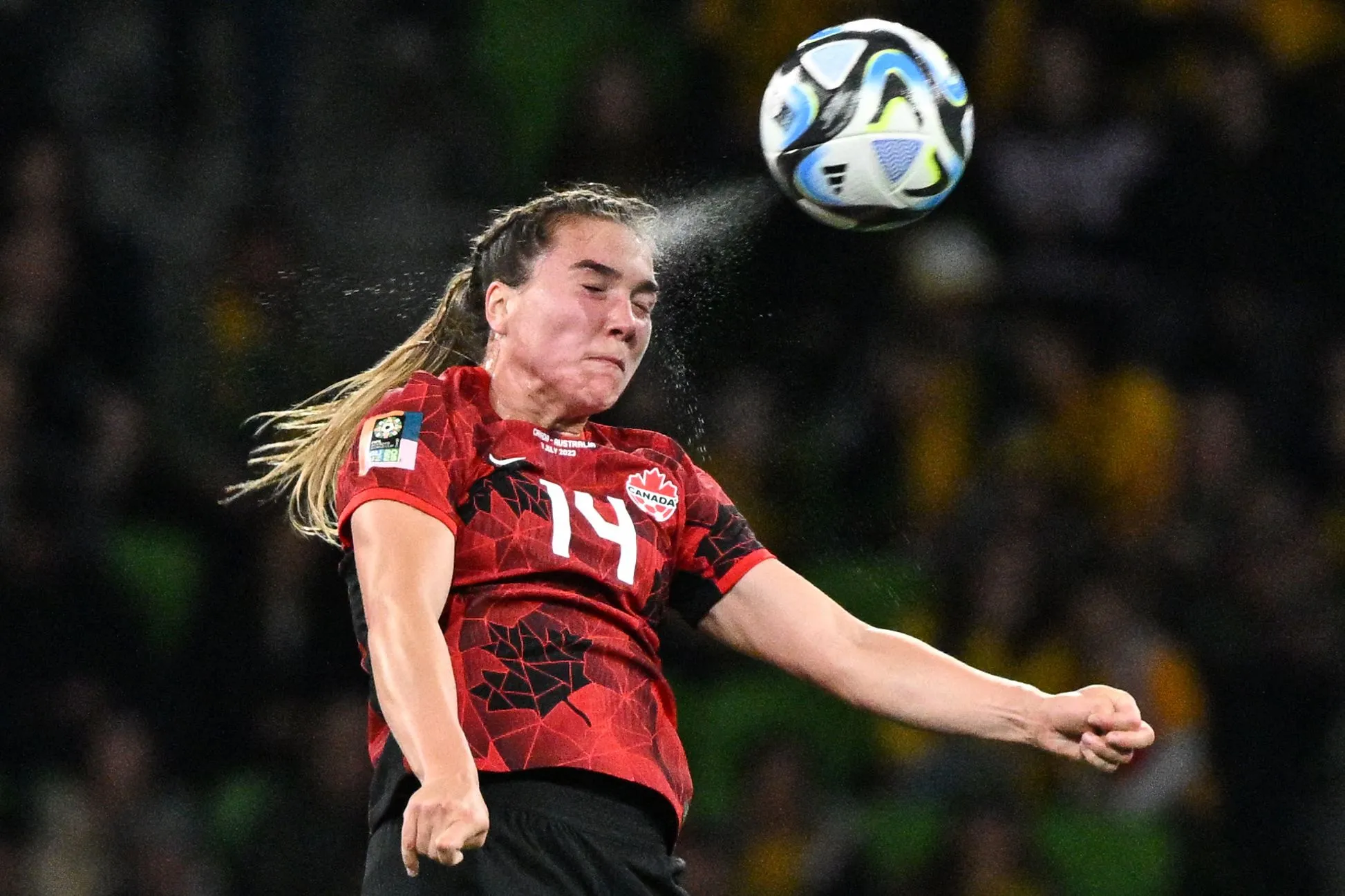 Canada's defender #14 Vanessa Gilles heads the ball during the Australia and New Zealand 2023 Women's World Cup Group B football match between Canada and Australia at Melbourne Rectangular Stadium, also known as AAMI Park, in Melbourne on July 31, 2023. (Photo by William West/AFP Photo)