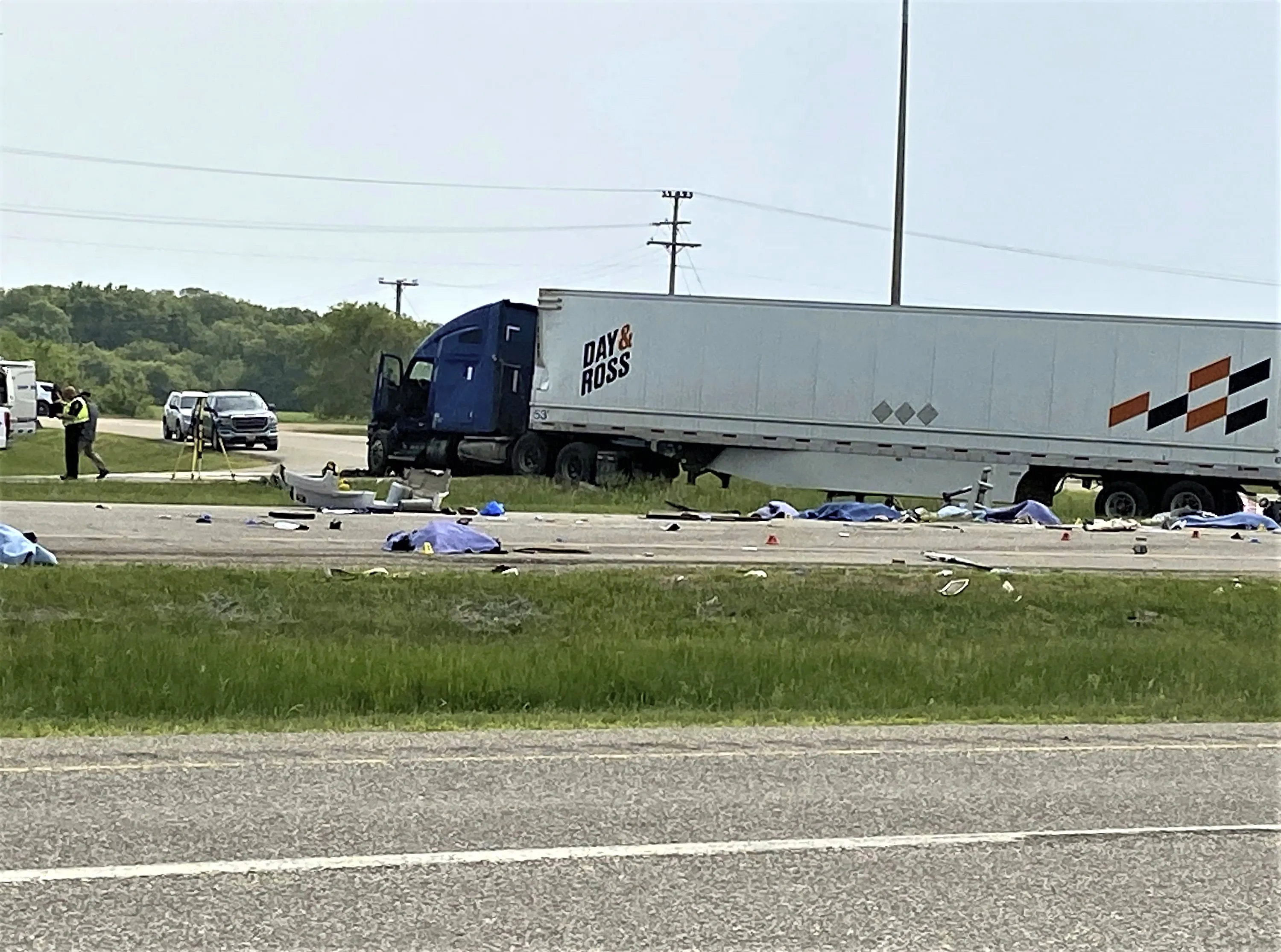 This photo shows the scene of a major collision that has closed a section of the Trans-Canada Highway near Carberry, Manitoba on Thursday June 15, 2023. Authorities did not confirm casualties, but health officials said they were preparing a mass casualty response. (Photo by Steve Lambert/The Canadian Press via AP Photo)