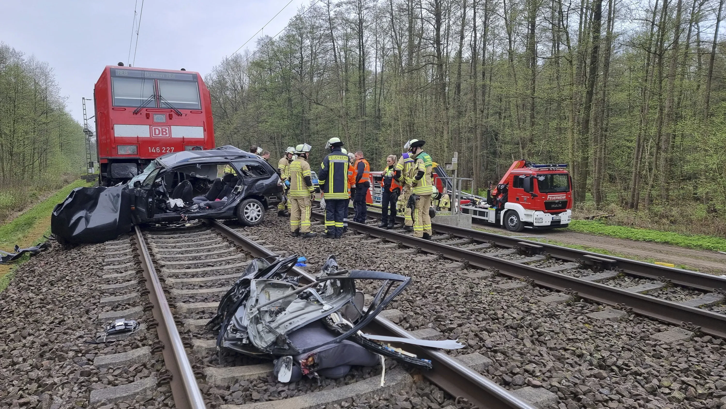 Emergency services at the scene of an incident, in Neustadt am Rubenberge, Germany, Sunday, April 23, 2023. Police say a train has hit a car at a crossing in northern Germany, killing all three people in the car. The regional train hit the car at full speed near Neustadt am Ruebenberge, outside the city of Hannover on Sunday morning. (Photo by TNN/dpa via AP Photo)