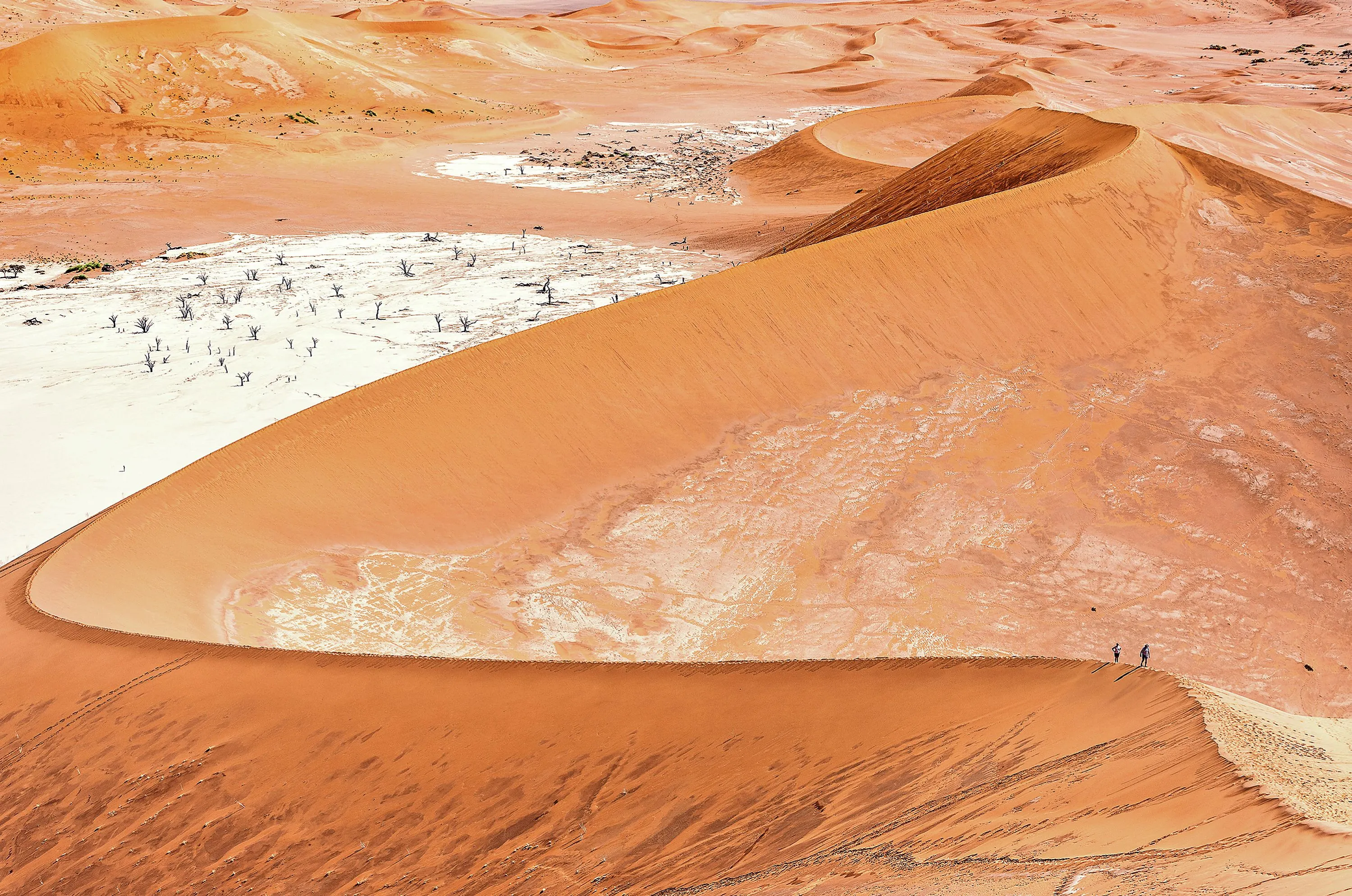 Walkers are dwarfed as they are surrounded by golden sand while trekking through a desert. The photo were taken by Marco Tagliarino at the Namib Sand Sea desert in Namibia in the last decade of June 2023. (Photo by Marco Tagliarino/Solent News)