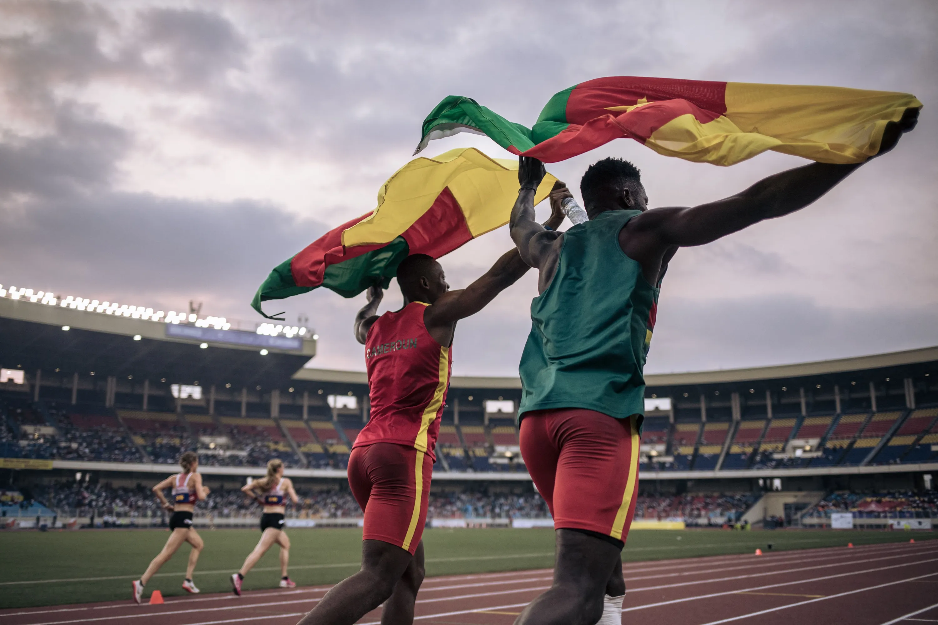 Cameroon's Raymondo Nkwemy Tchomfa (2nd R) and Cameroon's Appolinaire Yinra (R) celebrate their respectively 3rd and 1st place at the long jump men's final while in the background Swiss's Selina Hummel (L) and Swiss's Sereina Hummel (2nd L) compete for the 10.000m women's final at the 9th Francophone Games in Kinshasa, on August 1, 2023. The President of the Republic, young people and families gathered in Kinshasa's largest stadium on Tuesday for a big day of athletics, halfway through the 9th Jeux de la Francophonie. August 1, “Parents' Day”, is a public holiday in the Democratic Republic of Congo. (Photo by Alexis Huguet/AFP Photo)