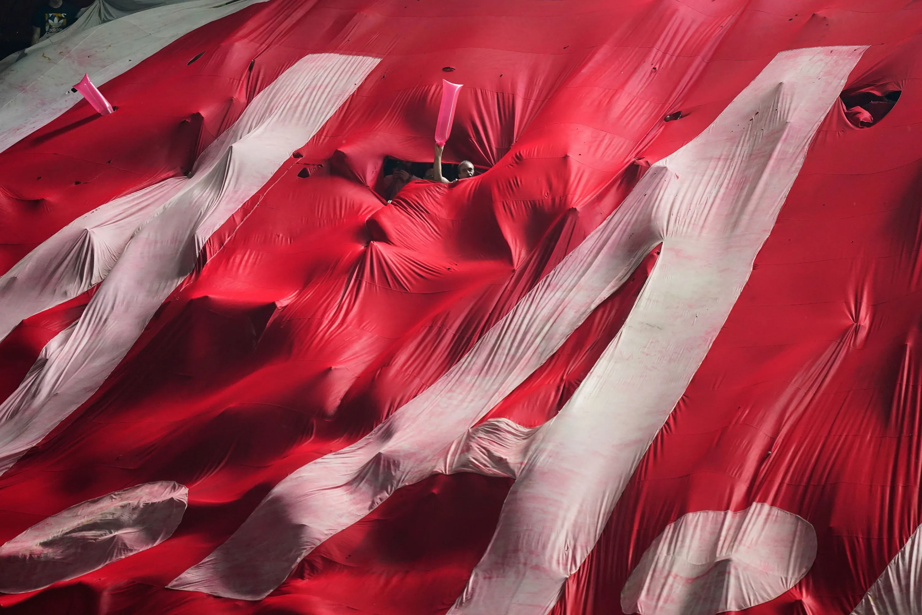 Argentina's Argentinos Juniors fan cheers under a giant team banner, prior to a Copa Libertadores round of 16 first leg soccer match against Brazil's Fluminense at Diego Armando Maradona stadium in Buenos Aires, Argentina, Tuesday, August 1, 2023. (Photo by Ivan Fernandez/AP Photo)