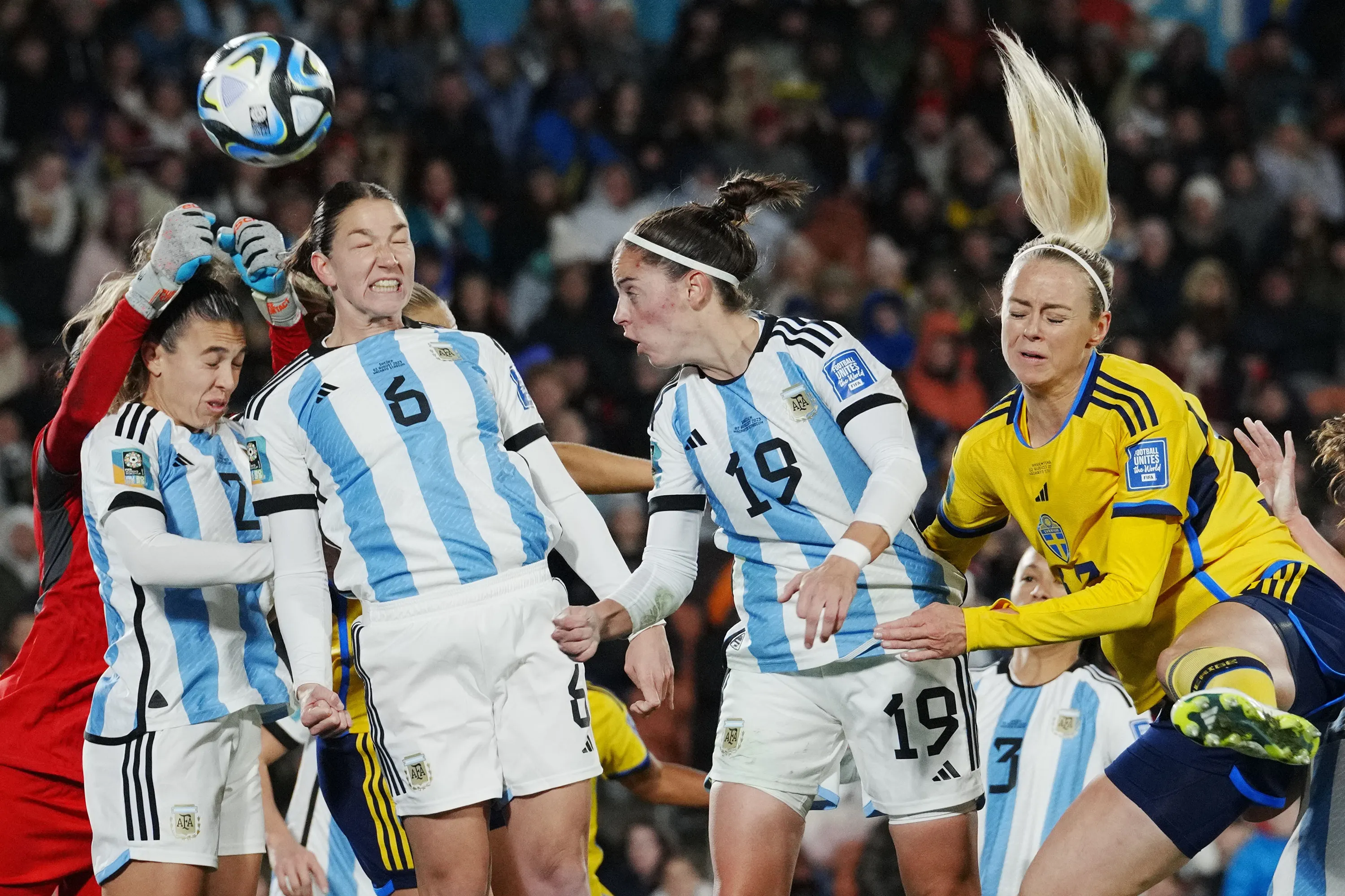 Argentina's goalkeeper Vanina Correa, from left, Argentina's Adriana Sachs, Argentina's Aldana Cometti, Argentina's Mariana Larroquette and Sweden's Amanda Ilestedt challenge for the ball during the Women's World Cup Group G soccer match between Argentina and Sweden in Hamilton, New Zealand, Wednesday, August 2, 2023. (Photo by Abbie Parr/AP Photo)