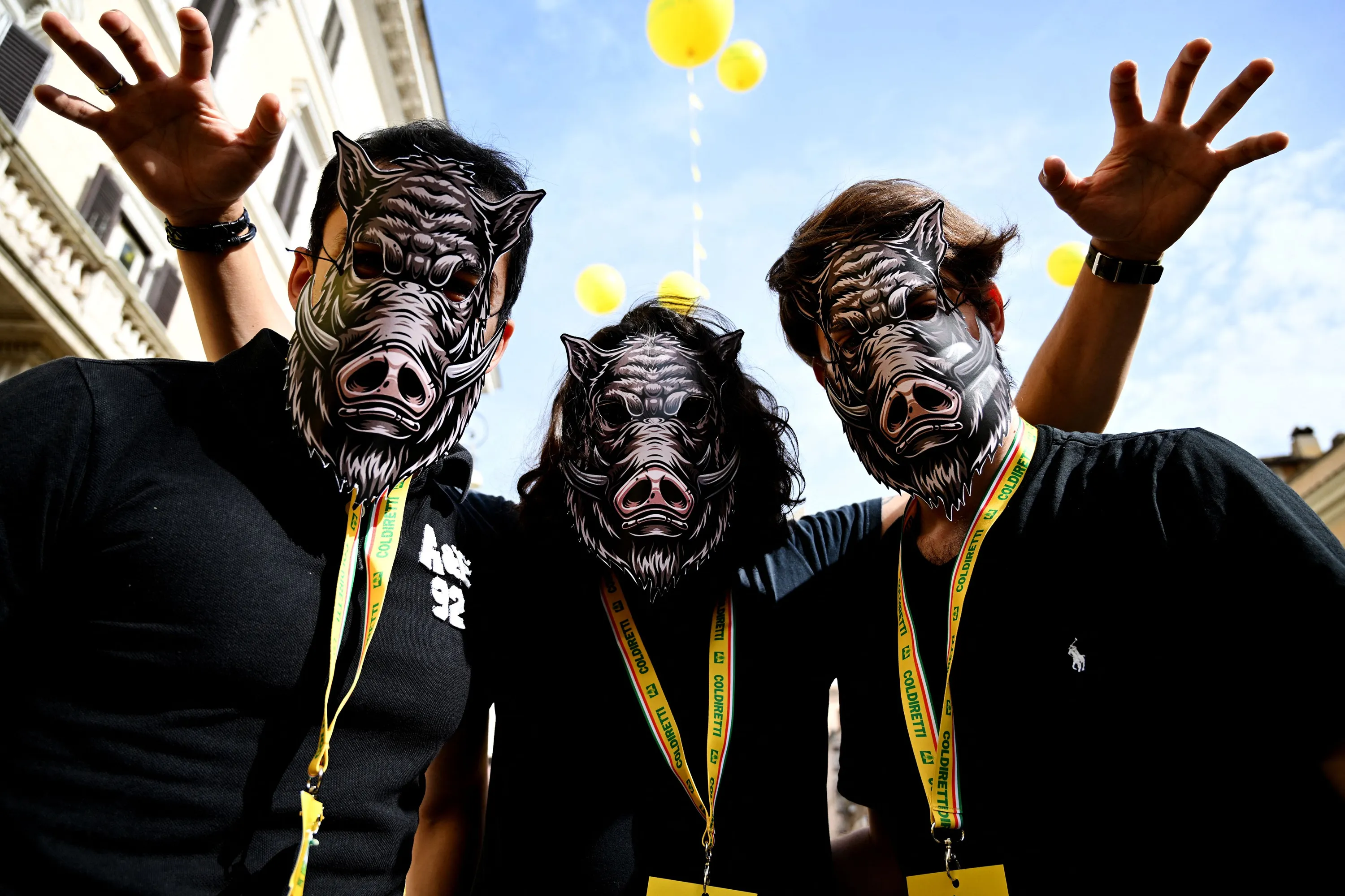 Members of the Coldiretti farmers' association, wearing masks of wild boars, protest against invasive wild boars as part of a national action on May 27, 2022 in downtown Rome. Farmers aim at denouncing the risks posed by wild boars who transmit diseases like swine fever, destroy food production, exterminate crops, besiege fields, and cause road accidents. (Photo by Tiziana Fabi/AFP Photo)