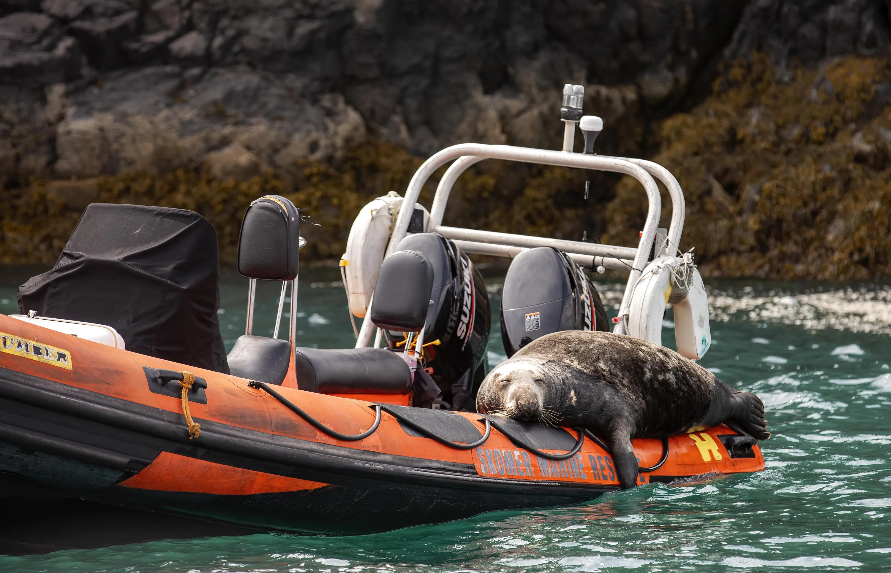 A grey seal has a mid-day sleep on a rescue boat at Martin's Haven, Pembrokeshire, south-west of Wales in the last decade of July 2023. (Photo by Brian Matthews/Animal News Agency)