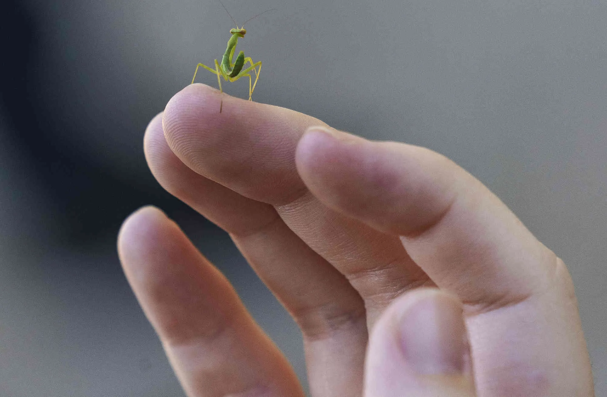 A praying mantis stands on the fingertip of a student at Occidental College in Los Angeles, Thursday, July 27, 2023. (Photo by Damian Dovarganes/AP Photo)