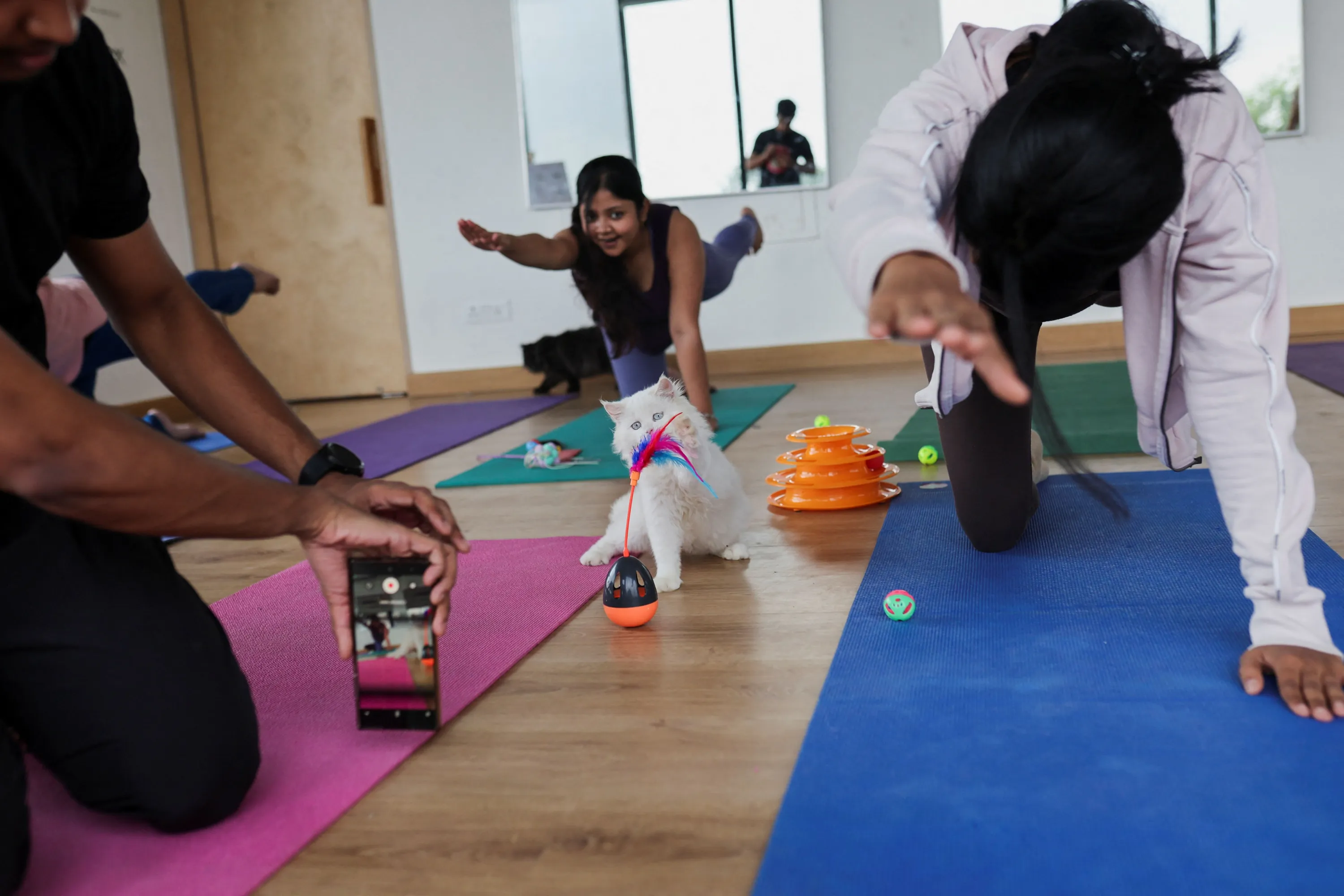 Participants perform yoga as the kittens play around them at a yoga session, which was organised by Pawhour, at a studio in New Delhi, India on August 6, 2023. (Photo by Anushree Fadnavis/Reuters)