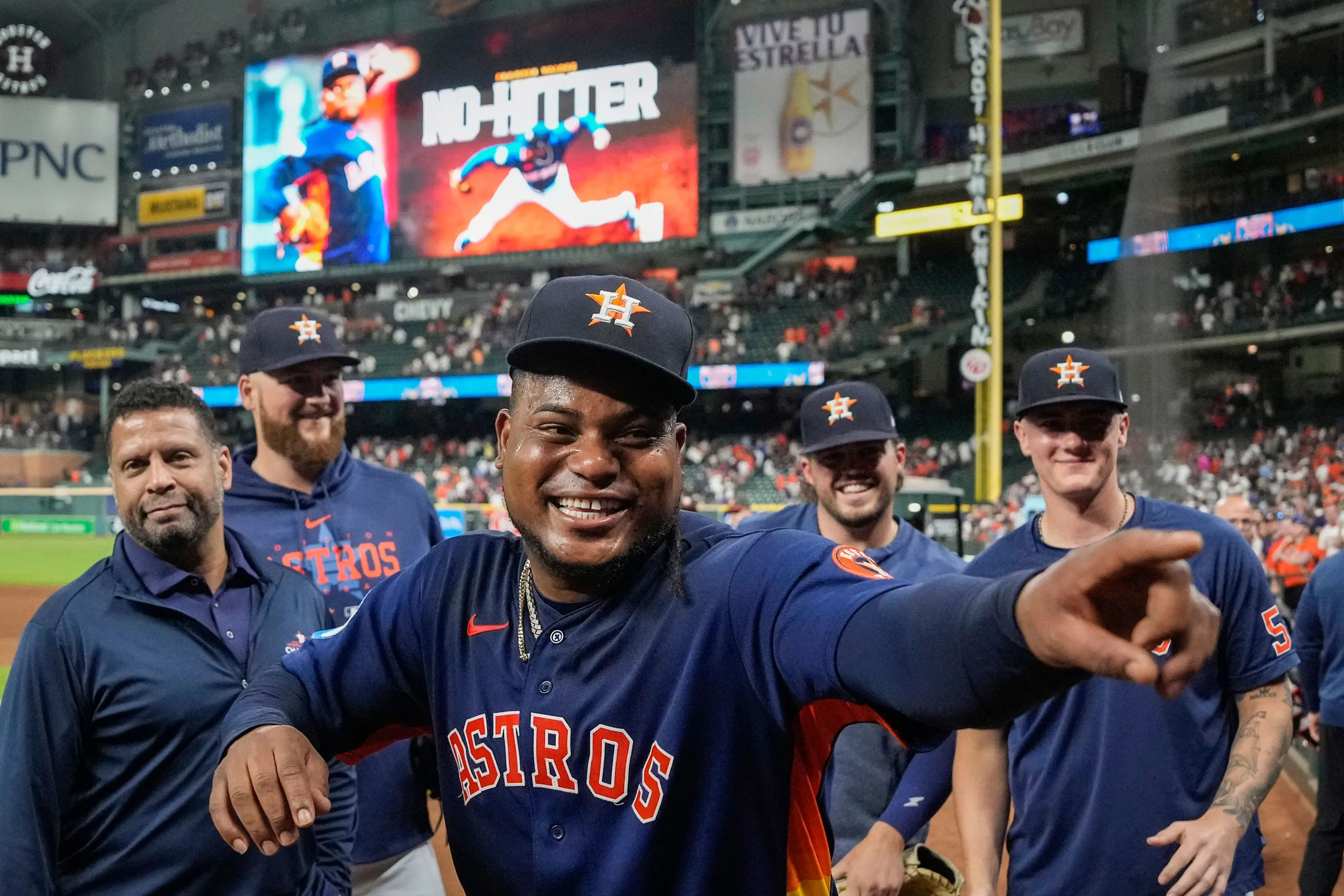 Houston Astros starting pitcher Framber Valdez celebrates after pitching a no-hitter against the Cleveland Guardians in a baseball game, Tuesday, August 1, 2023, in Houston. (Photo by Brett Coomer/Houston Chronicle via AP Photo)