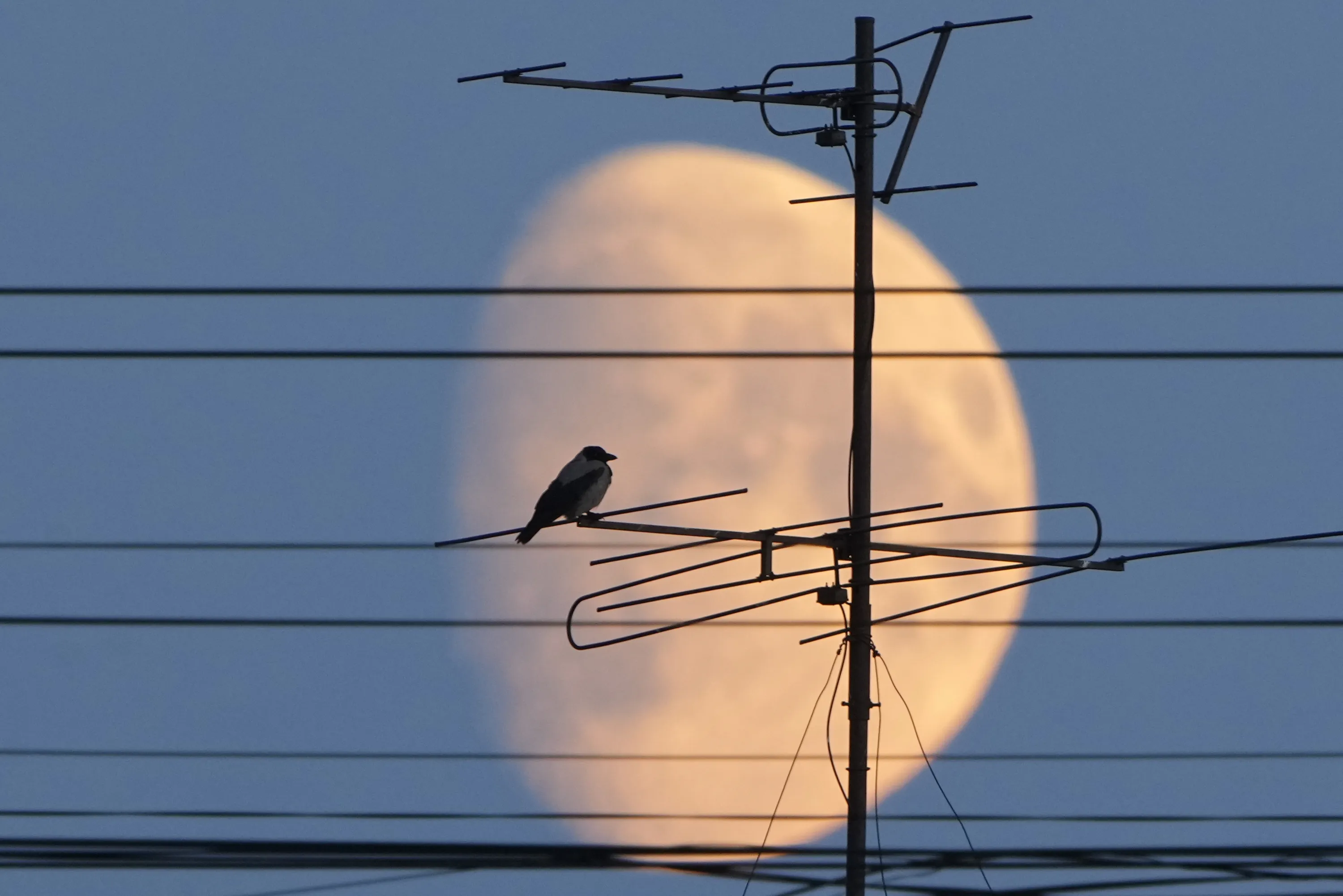 A crow sitting on a TV antenna is silhouetted against the moon in St. Petersburg, Russia, Friday, July 28, 2023. (Photo by Dmitri Lovetsky/AP Photo)