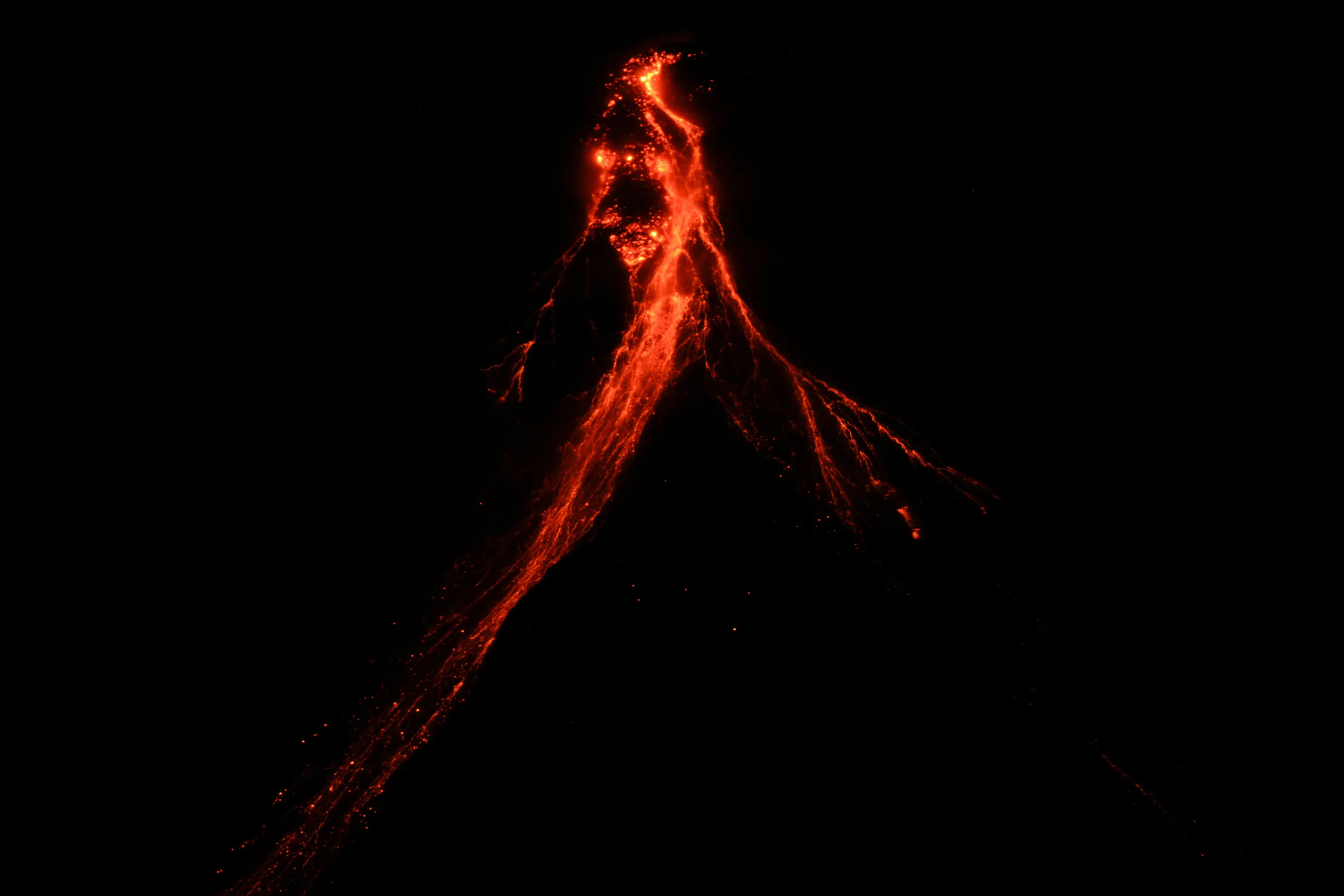 Mayon volcano belches red-hot emissions down it's slope as seen from Legaspi, Albay province, northeastern Philippines, Sunday, June 11, 2023. Albay was placed under a state of calamity last week to allow more rapid disbursement of emergency funds in case a major eruption unfolds. (Photo by Aaron Favila/AP Photo)