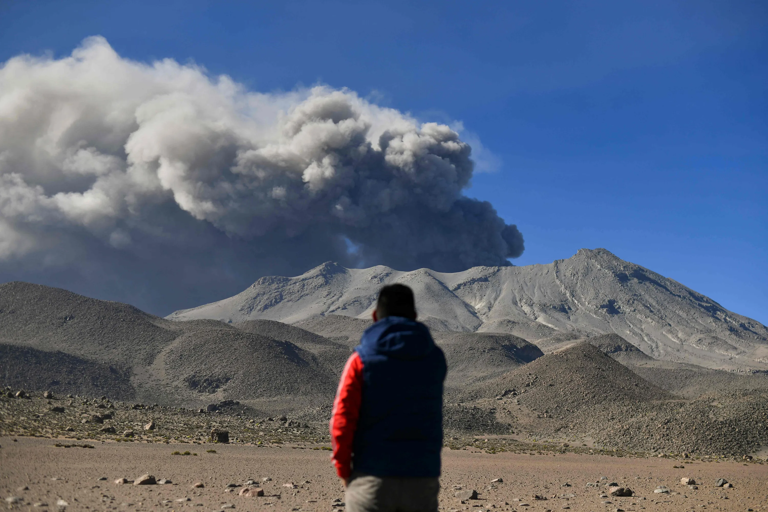 A man watches a smoke and ash stack rise from the Ubinas volcano's crater, located in the Moquegua region in southern Peru, on July 5, 2023. Peru's Ubinas volcano, active again after four dormant years, blew its top twice on July 4, showering nearby towns with ash, the country's IGP geophysical institute said. (Photo by Diego Ramos/AFP Photo)