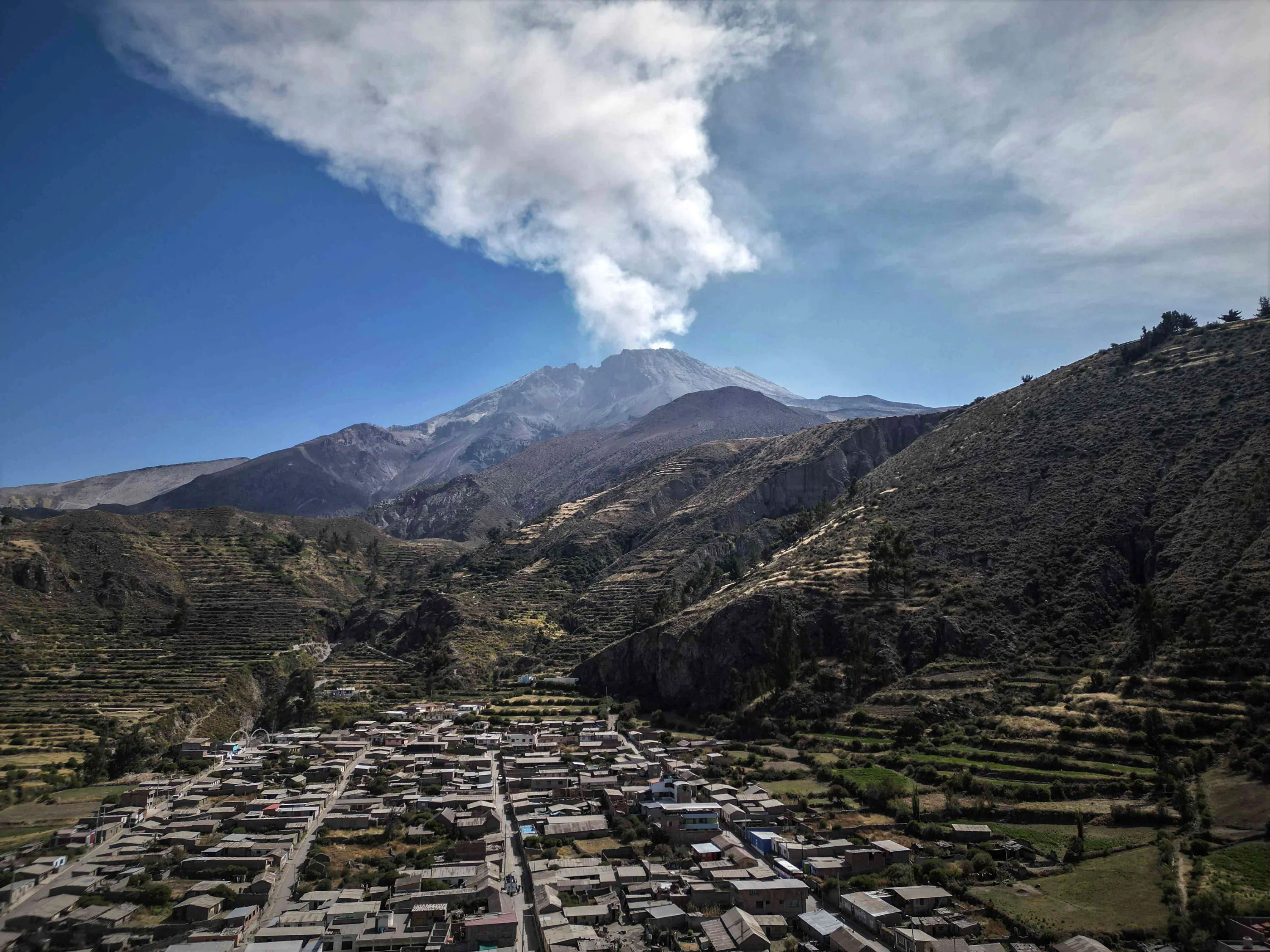 View of the Ubinas volcano from the town of Ubinas, in Moquegua, Peru, on 05 July 2023. The Council of Ministers of Peru approved on 05 July the declaration of a 60 day state of emergency for the districts near the Ubinas volcano (south), which is since 04 July in eruptive stage and has expelled columns of smoke and ash over 5 kilometers high. (Photo by EPA/EFE/Stringer)