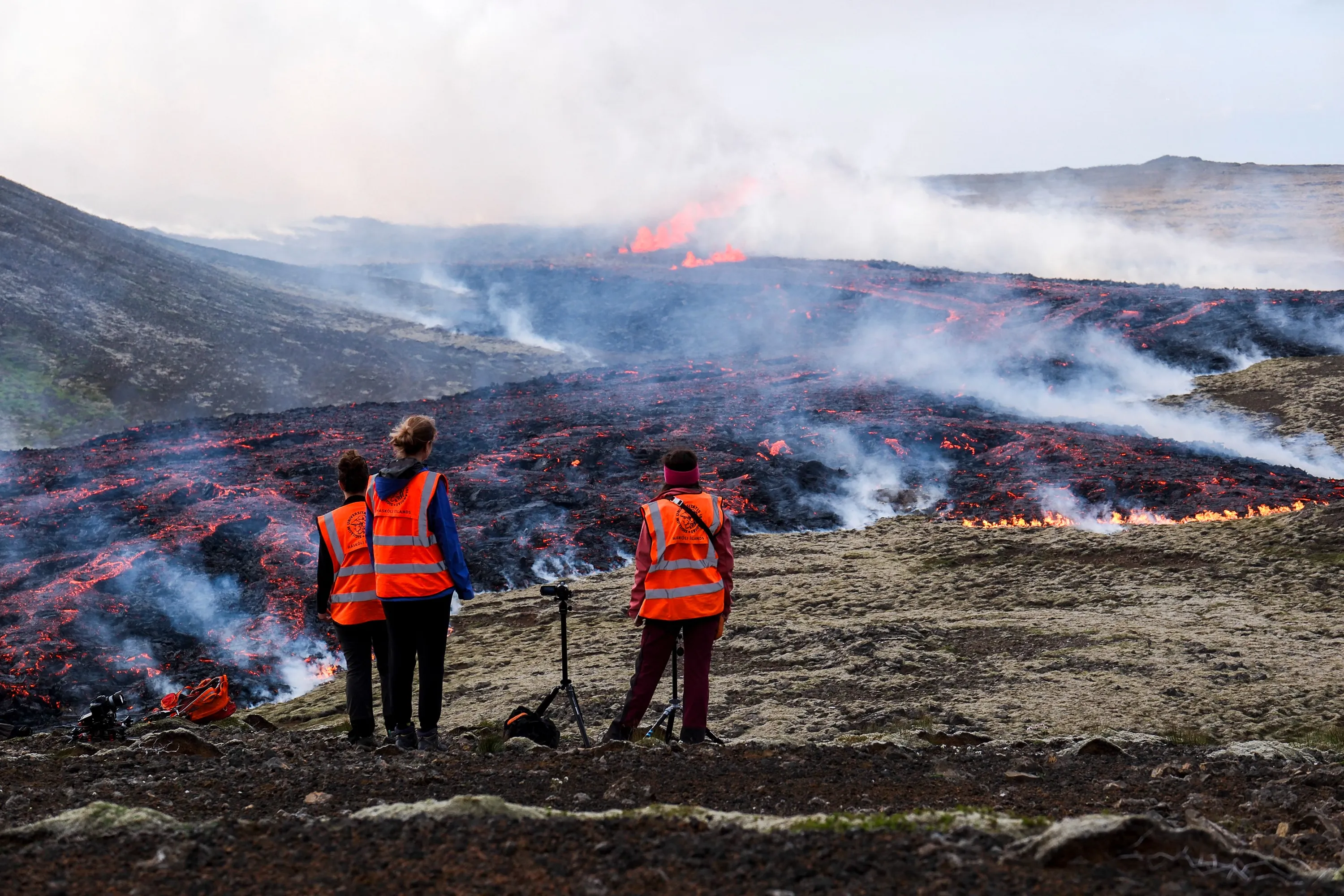 University of Iceland's observers stand in front of smoke billowing from flowing lava during an volcanic eruption near Litli Hrutur, south-west of Reykjavik in Iceland on July 10, 2023. A volcanic eruption started on July 10, 2023 around 30 kilometres (19 miles) from Iceland's capital Reykjavik, the country's meteorological office said, marking the third time in two years that lava has gushed out in the area. “The eruption is taking place in a small depression just north of Litli Hrutur, from which smoke is escaping in a north-westerly direction”, the office said. Footage circulating in the local media shows a massive cloud of smoke rising from the ground as well as a substantial flow of lava. (Photo by Kristinn Magnusson/AFP Photo)