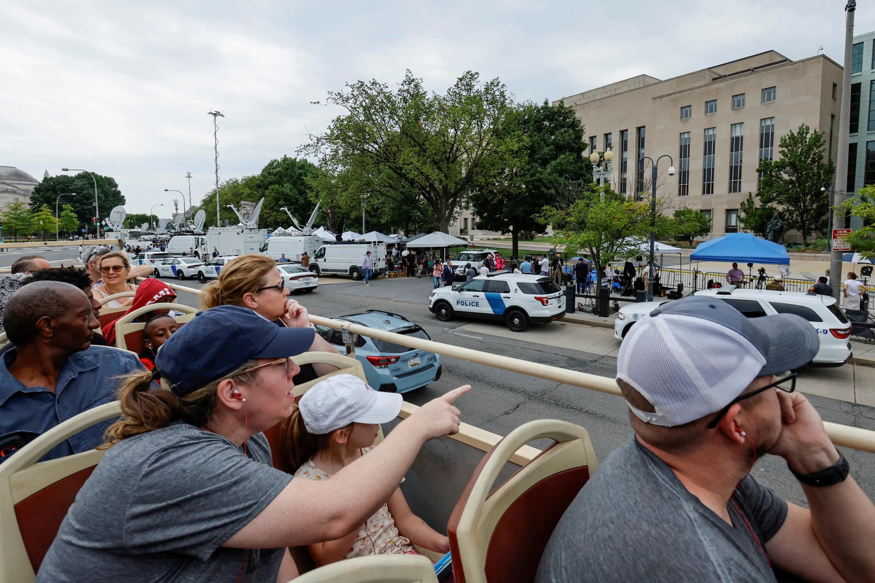 Tourists atop a double-decker tour bus pass by assembled reporters, law enforcement officers and demonstrators as they wait for former U.S. President Donald Trump, who is facing federal charges related to attempts to overturn his 2020 election defeat, to arrive at U.S. District Court in Washington, U.S., August 3, 2023. (Photo by Jonathan Ernst/Reuters)