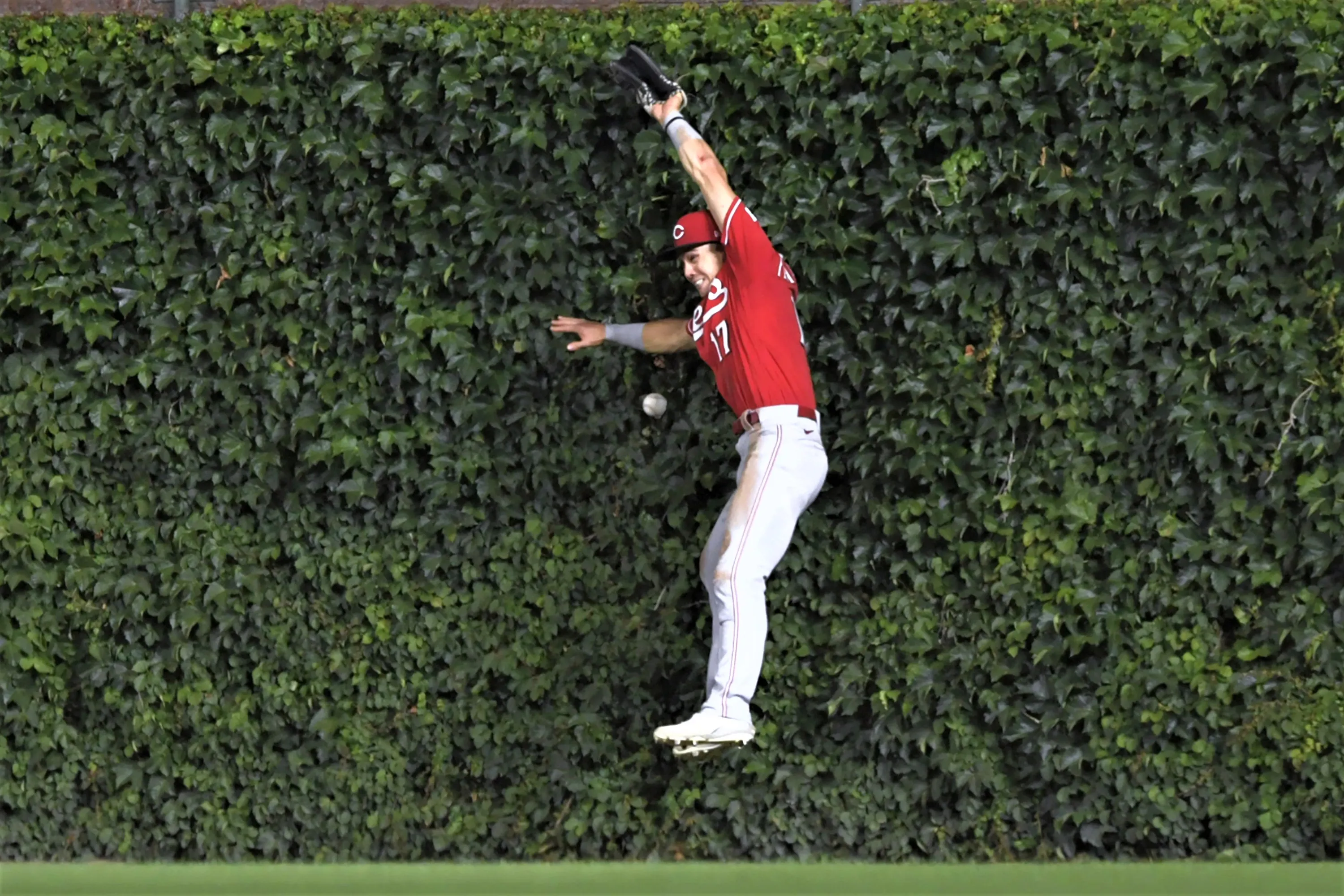 Cincinnati Reds center fielder Stuart Fairchild misses an RBI double by Chicago Cubs' Christopher Morel during the fifth inning of a baseball game Wednesday, August 2, 2023, in Chicago. The Cubs won 16-6. (Photo by Paul Beaty/AP Photo)